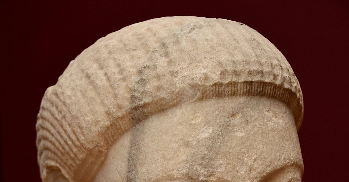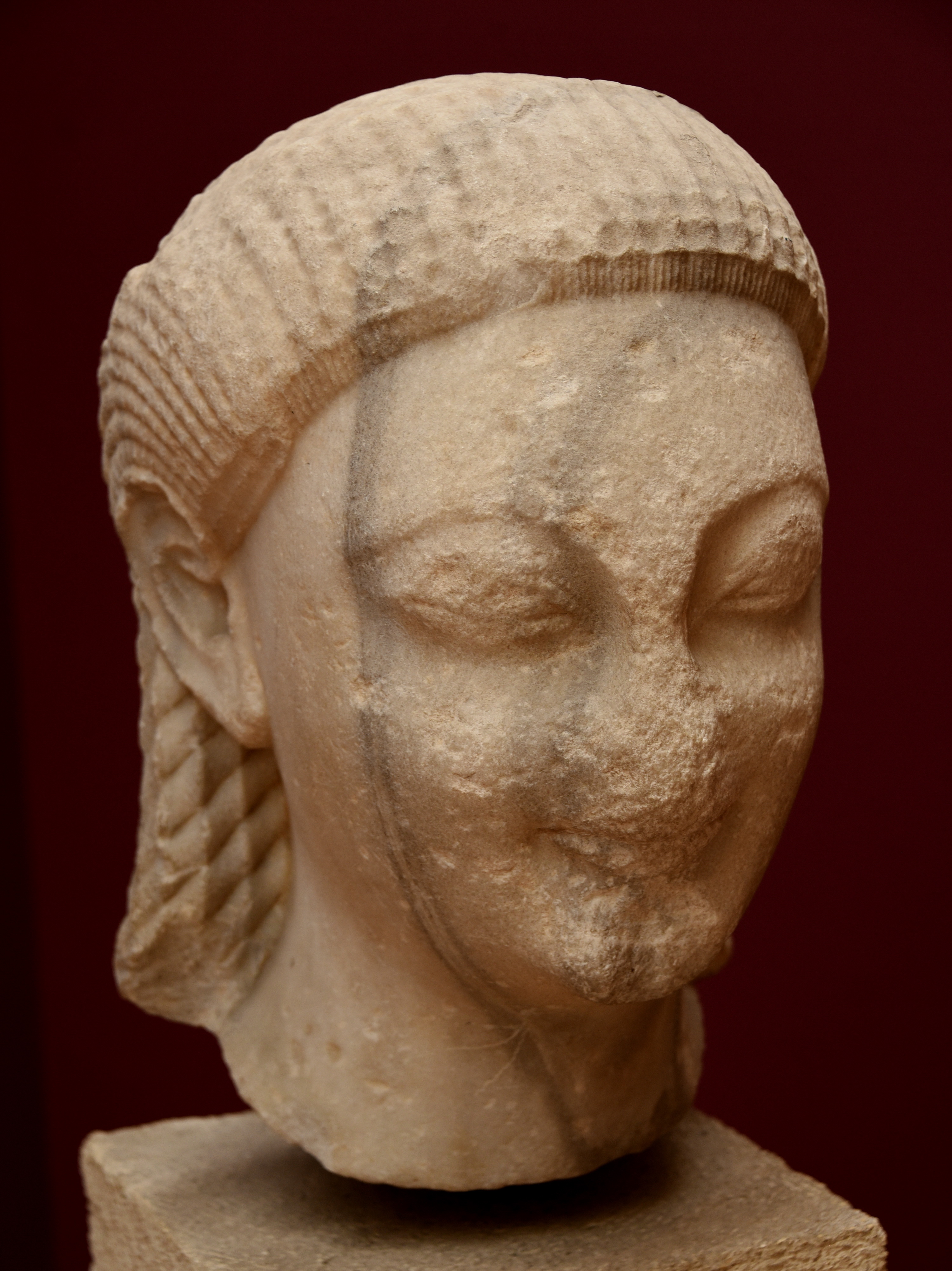 This is the head of a statue of a Greek youth or Kouros. The rest of the body is in the Samos Museum; the whole statue would measure about 3.2 meters in height. His hair is plaited and falls behind the head, down to the neck. The depiction of the lips and mouth gives a smiling appearance. Marble. Archaic Period, 6th century BCE. From Samos, in modern-day Greece. (Museum of Archaeology, Istanbul, Turkey).