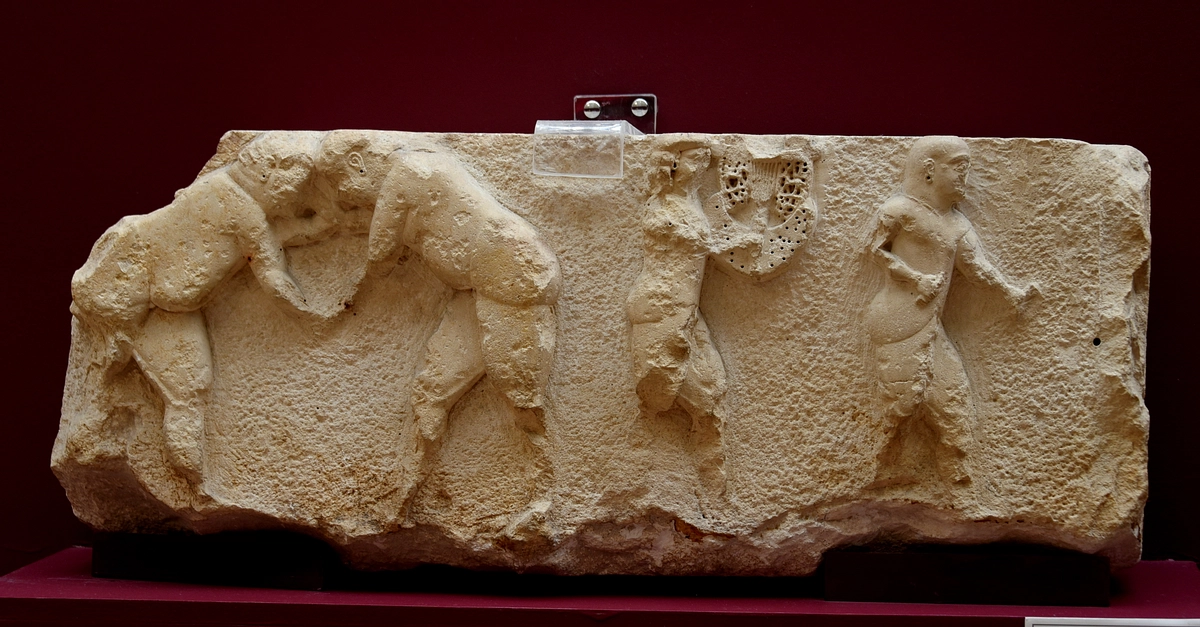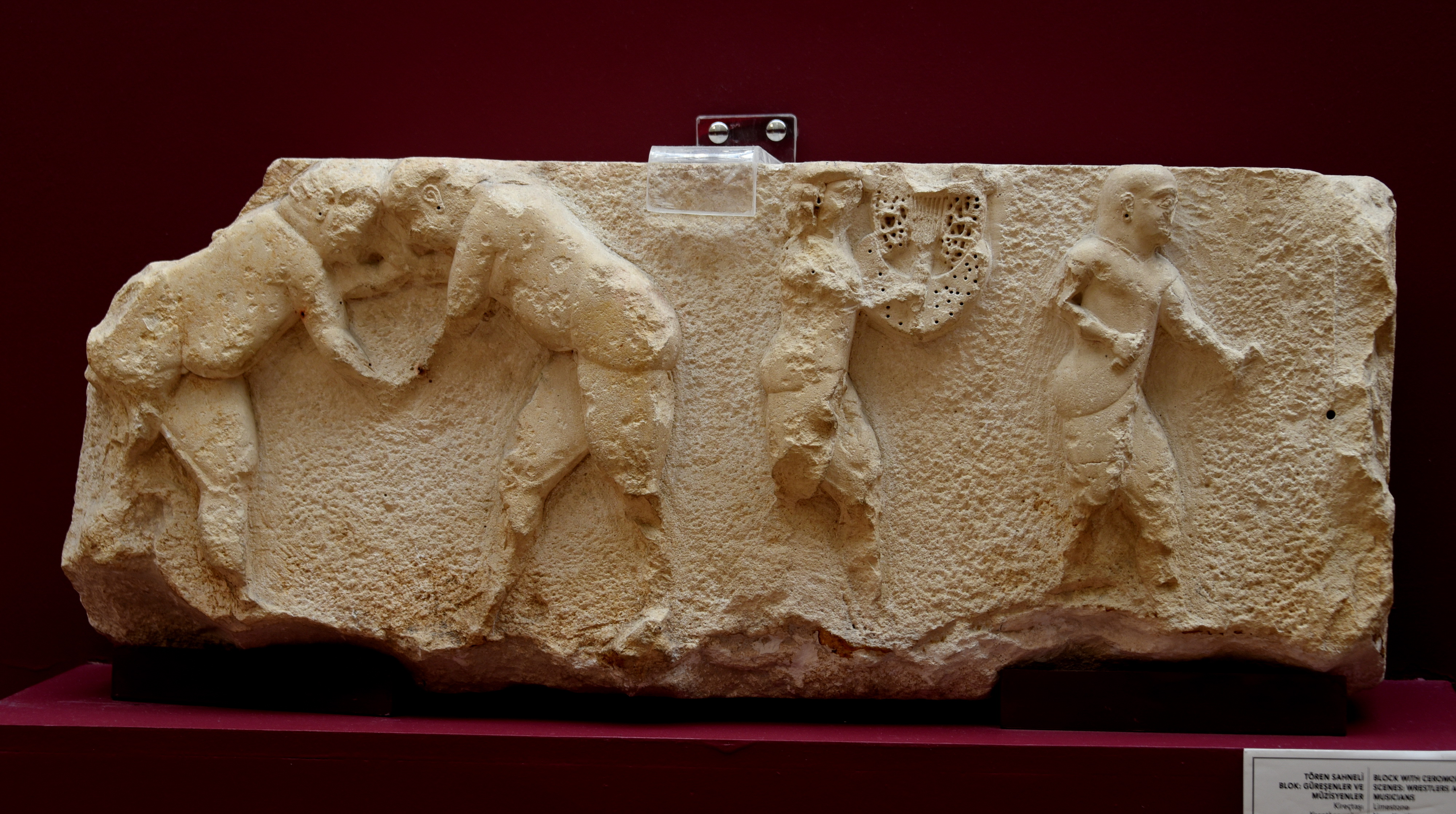 On the left, two men are wrestling while on the right there are two musicians; the musician on the left seems to play the lyre. Archaic Period, late 6th century BCE. From Xanthos, Kınık, in modern-day Turkey. (Museum of Archaeology, Istanbul, Turkey).