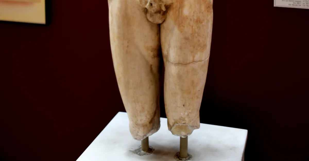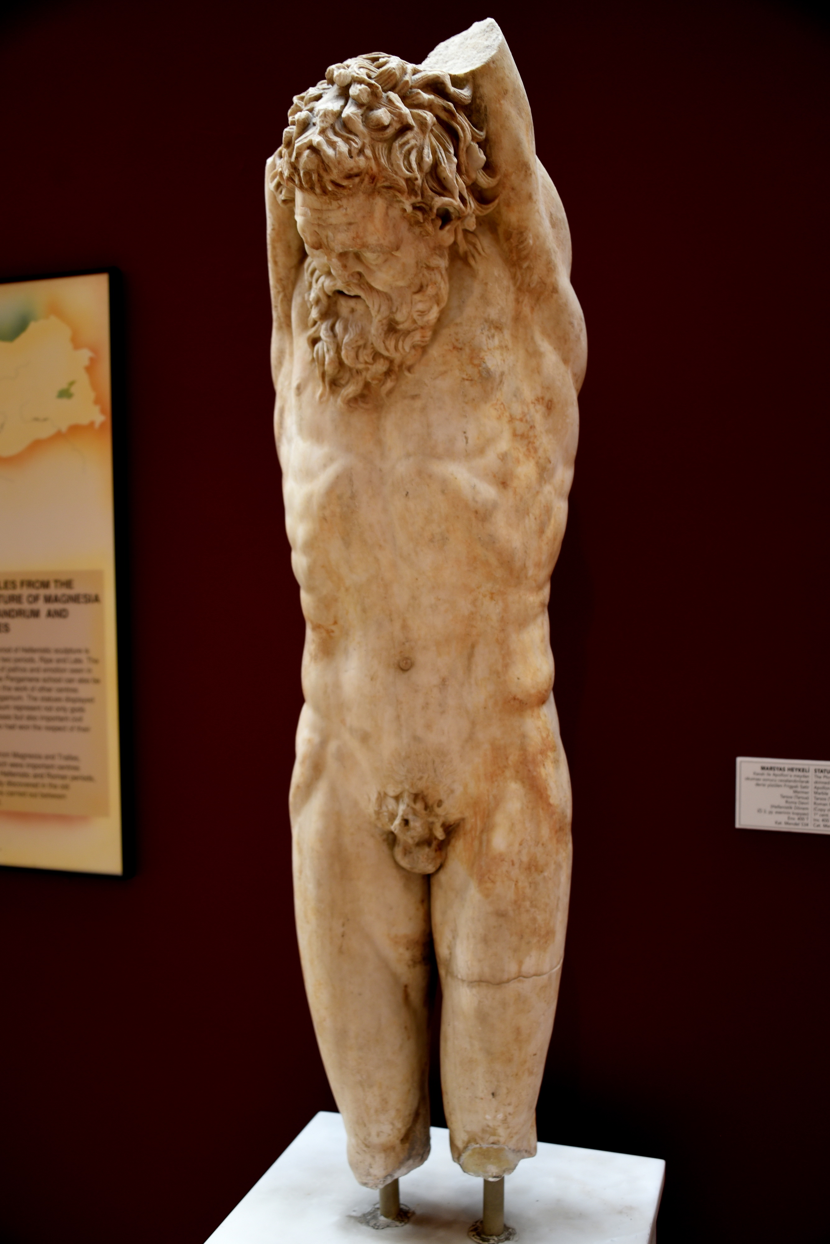 Marsyas was the Phrygian satyr who was skinned alive when he challenged Apollo to a musical contest and lost. Marsyas was usually sculpted alone, as an isolated statue. However, this statue was found as part of a group of statues, depicting a seated Apollo (on his left side) and a Scythian slave (sharpening a knife to flay Marsyas) on his right side. Here, he was depicted suspended from a tree by his arms (now lost). His body and face show signs of torture and agony. Marble. Roman Period, copy of an original from the 3rd century BCE. From Tarsos (Tarsus), Mersin, in modern-day Turkey. (Museum of Archaeology, Istanbul, Turkey).
