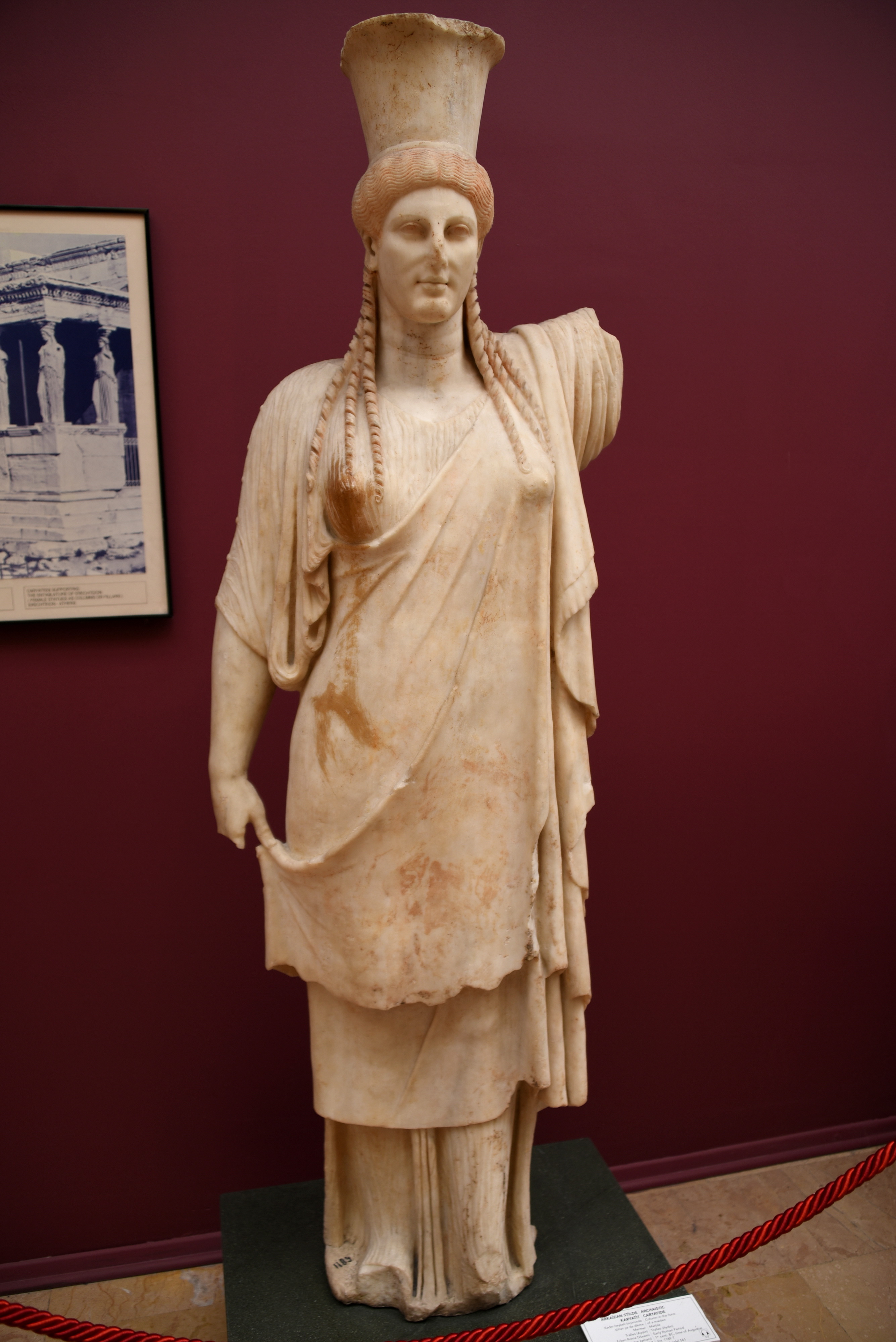Statue in the form of a Caryatid in the Archaistic Style shows a standing woman. The right arm hangs by her side and holds her himation. The left arm is raised (the distal part is now lost) as if she intends to carry the load of an architrave (which would have been placed on her cylindrical headdress or polos). The details of the chiton and her hair were exquisitely carved. Although the overall depiction refers to a Caryatid, it should not be assumed that this statue was originally made as an architectural element of a building. Marble. Early Roman Period, 1st century CE. From Tralles, Aydin, in modern-day Turkey. (Museum of Archaeology, Istanbul, Turkey).