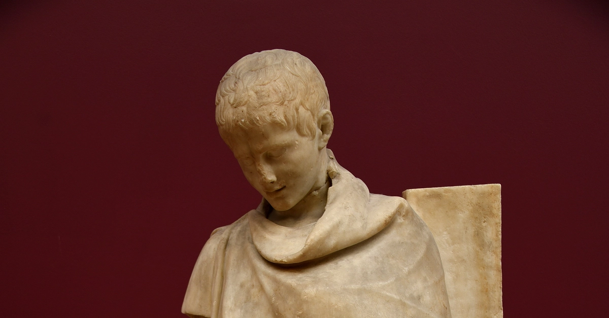 This is an ephebe, a young athlete, probably around the age of 12 years. He is leaning on a long rectangular pillar; the latter would have been originally topped by a herm or some kind of a relief. He must have just finished his exercise and he seems to be recovering from that strenuous exercise. This statue was probably placed within a gymnasium. Marble. Early Roman Imperial Period, late first century BCE to early first century CE. From Tralles, Aydın, in modern-day Turkey. (Museum of Archaeology, Istanbul, Turkey).