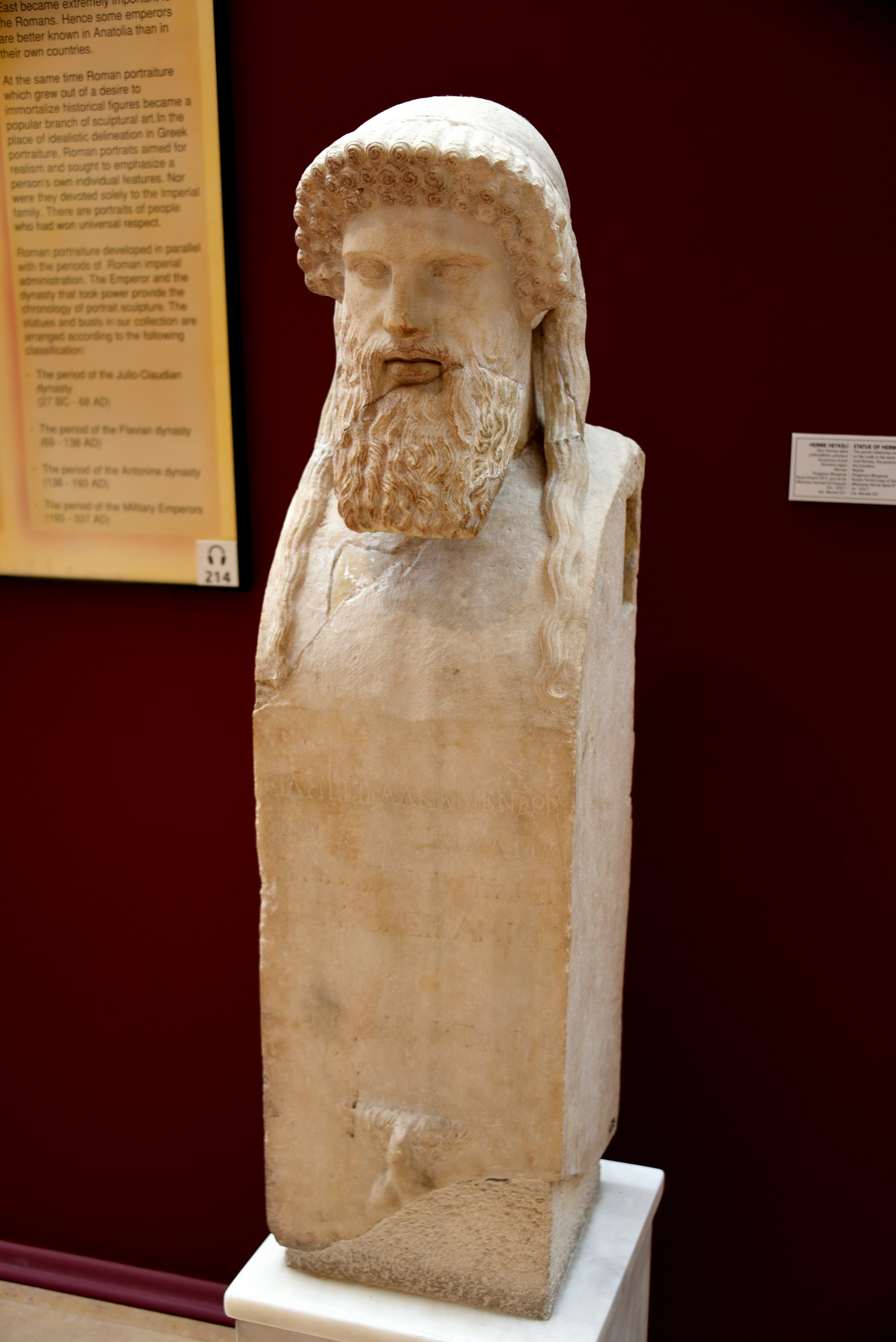 The inscription on the frontal part of the pillar reads, in Greek, "You will recognize the fine statue by Alkamenes, the Hermes before the Gates, Pergamios gave it, know thyself". This is a copy of an original sculpted by the Greek sculptor Alkamenes of Athens, during the 5th century BCE. The Pergamene sculptor had copied the inscriptions as well. This statue was one the sacred milestones erected on the roads in the name of the god Hermes, the protector of the travelers. Roman Period. From Pergamon, Bergama, in modern-day Turkey. (Museum of Archaeology, Istanbul, Turkey).