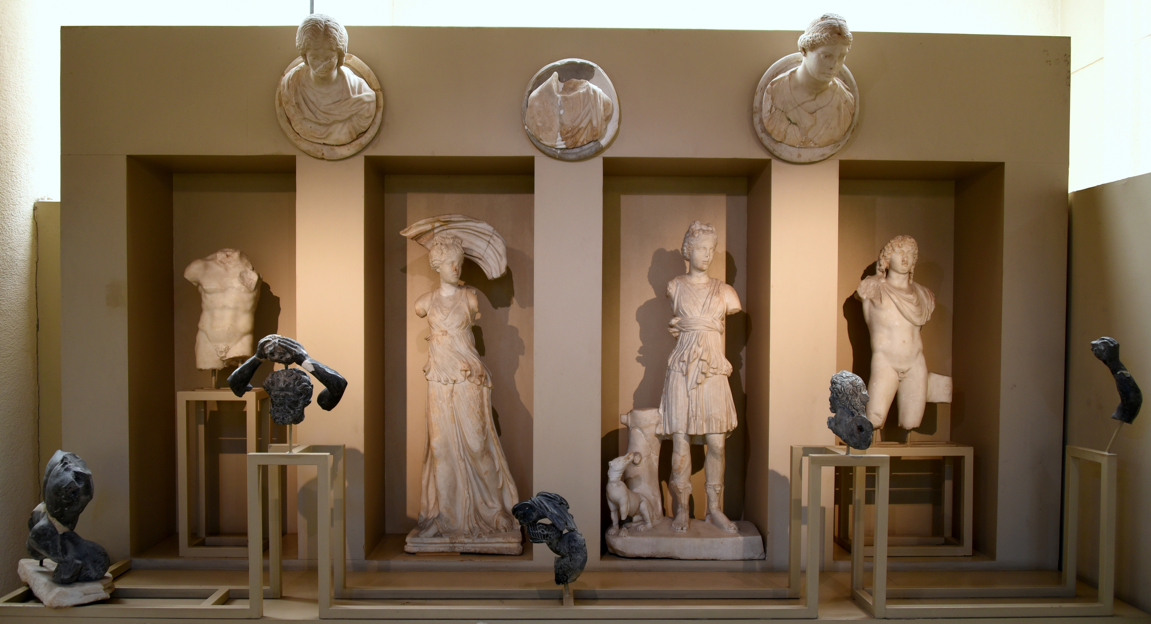 This is the so-called "Silahtarağa Statuary Group". The remains came to light during excavations for the foundations of a building on the road between the quarter Eyub and Alibeykoy near the Golden Horn. Between 1949-1950 many fragments of statues were recovered from the place, within a structural complex. That ancient structure was composed of a square-shaped room with 6 niches on the anterior and 2 small adjoining rooms. The structure, after studying the first phase of it, is thought to be a nymphaion or a large fountain connected to the sacred field of Semestra, or it could be a museion dedicated to the works of Muses. However, the 2nd phase of the use of the building occurred in the 3rd century CE. A variety of votive statues were found; therefore, the structure might well have been a sacred place. Here, this scene of statues fragments and remains depicts a battle between gods/goddesses (the deities were white in color) and giants (were carved using a black stone). The striking feature here is that the battle was depicted using separate free-standing statues to reenact the event; other battles between deities and giants (Gigantomachy) were depicted in bas-reliefs. The statues of the deities (made of marble from Aphrodisias) were brought to Byzantium from Aphrodisias in a rough and unfinished form. This group of statues dates to the 2nd century CE. Silahtarağa is in modern-day Istanbul, Turkey. (Museum of Archaeology, Istanbul, Turkey).