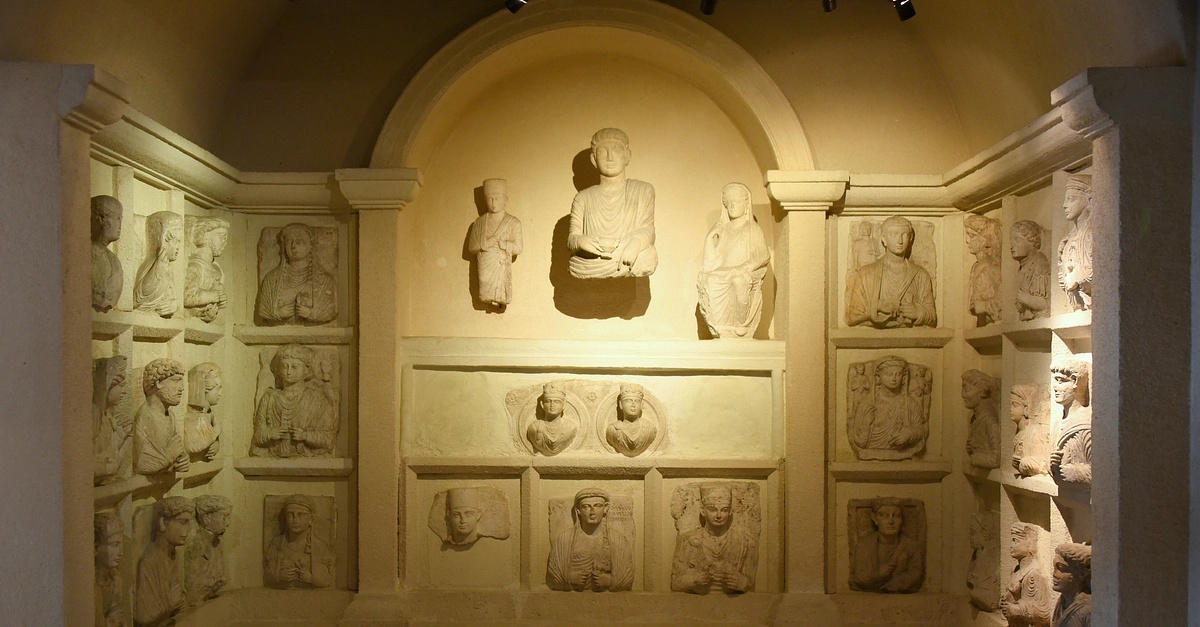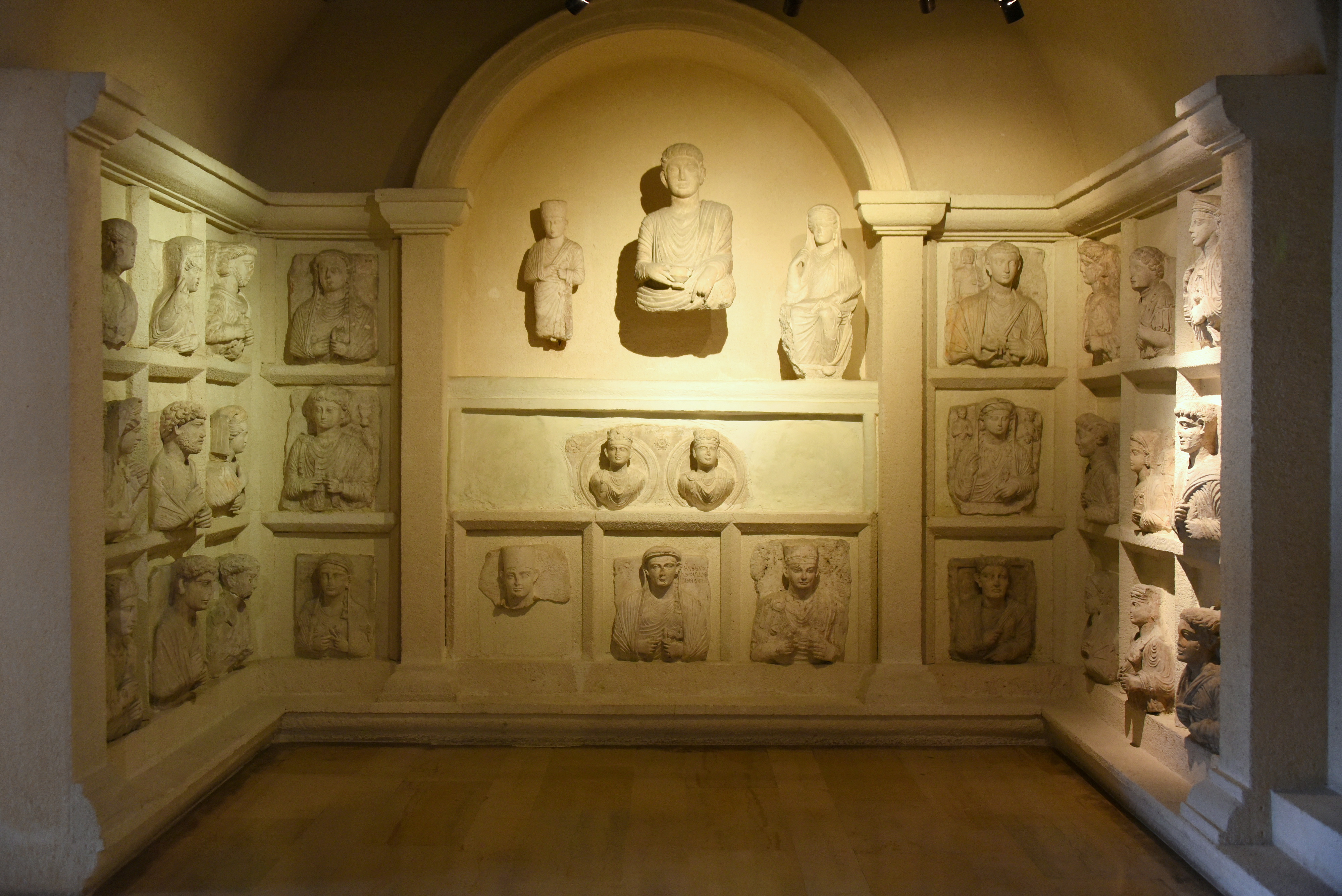 The hypogea or underground tombs, along with the tower tombs and house tombs, constitute an important part of the monumental burials of the wealthy Palmyrene class in the first and second centuries CE. The underground galleries were, most of the time, shaped like a "T" or cruciform, with the loculi into which the bodies of the dead were placed covering the walls. After placing the corpse, the places were sealed with sculptural portraits of the deceased. A dedicatory inscription, stating the names of the personages for whom the hypogeum was built was often placed above the entrance of the hypogeum. The hypogeum in the picture was modeled after an original, built in 108 CE in the Valley of the Tombs, belonging to the Yarhai Family. The interior of the hypogeum was faced with hard limestone articulated as pilasters, niches, arches, and similar Greek architectural elements. The original sculptures of the Yarhai hypogeum were transported to Damascus Museum where it was partly reconstructed. Limestone. Roman Period, first to third century CE. From the Valley of the Tombs at Palmyra, in modern-day Syria. (Museum of Archaeology, Istanbul, Turkey). Source of the description was taken from the book "Istanbul Archaeological Museums" by Alpay Pasinli.