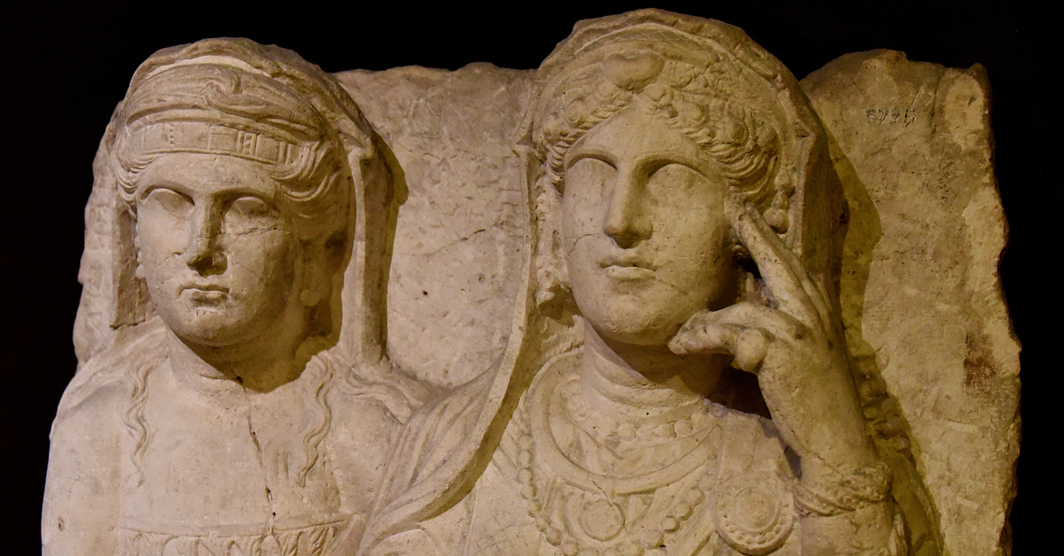 This relief depicts an older woman with her daughter. They are set in a line, represented frontally, stiff, and lifeless. Both of them wear turbans and headbands. At their temples, long strands of hair are combed back and tucked into the turbans. The younger woman is dressed in a tunic which leaves her arms and shoulder open. Her shawl covers only her head and two long strands of hair fall on her chest. She does not wear any jewelry. The older woman is draped in a tunic, chiton, and shawl. She is adorned with rich jewelry in the Palmyrene fashion. The carved inscription mentions that the two figures are Salmat and her daughter Hagge. Roman Period, 200-273 CE. From Palmyra, in modern-day Syria. (Museum of Archaeology, Istanbul, Turkey). Source of the description was taken from the book "Istanbul Archaeological Museums" by Alpay Pasinli.