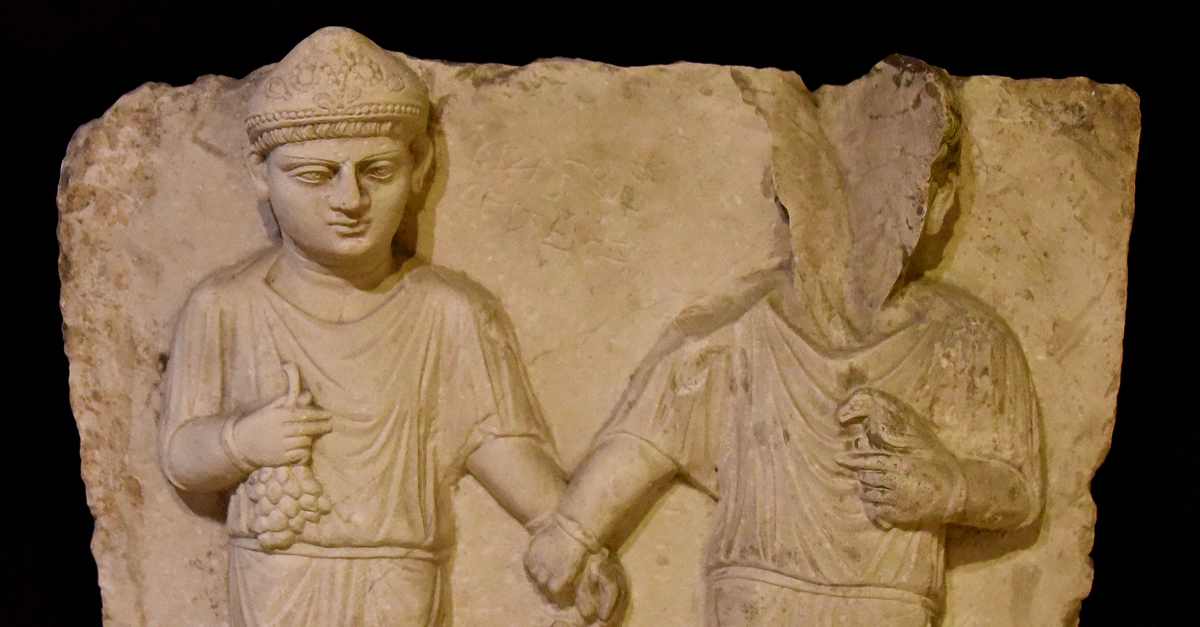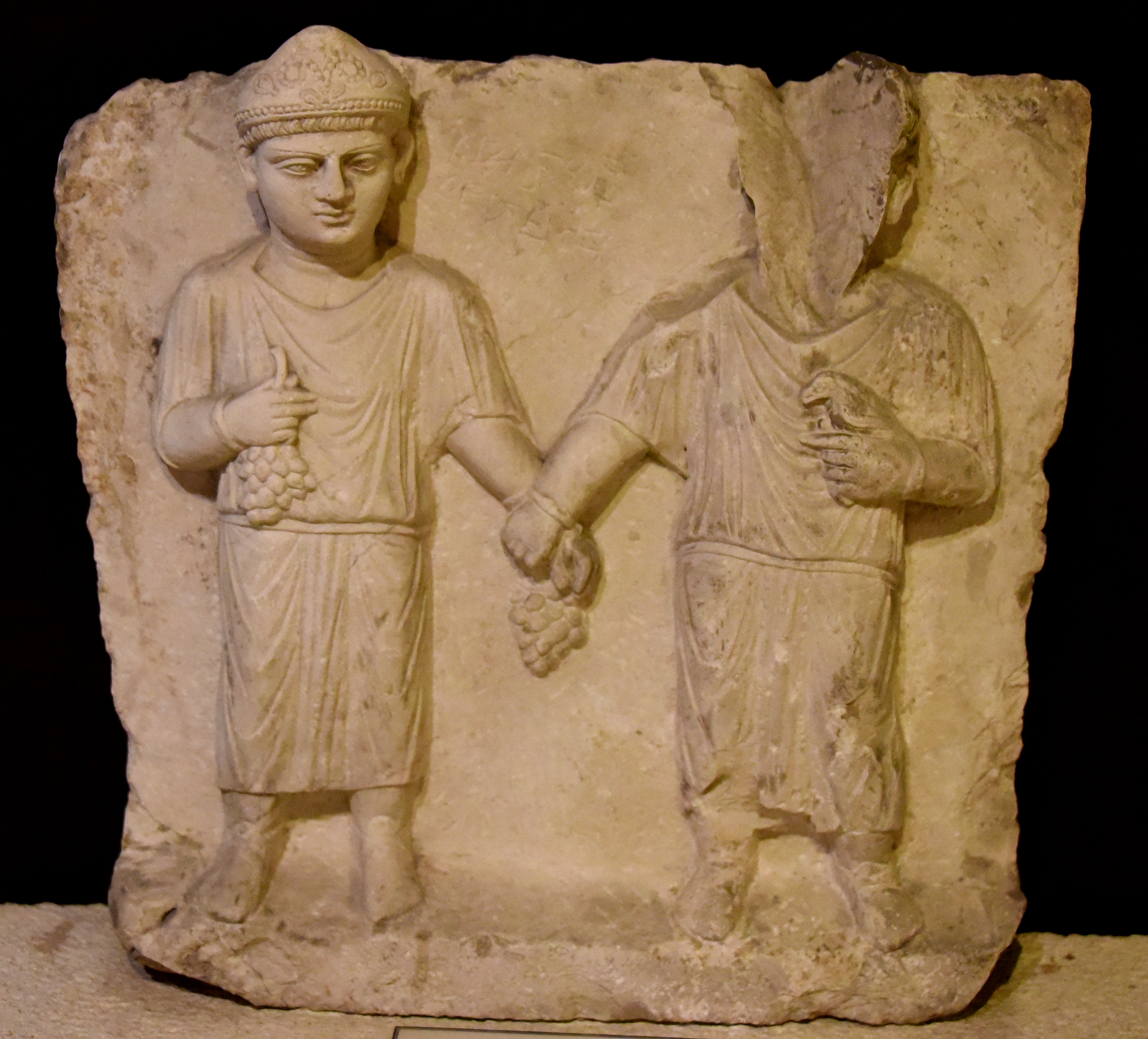 The two young boys were represented frontally and are of a similar height. They wear the same type of clothes. The boy on the left side holds a bunch of grapes in each hand. The boy on the right grasps the left wrist of the right boy and there is a bird on his left hand. Limestone. Roman Period, second century CE. From Palmyra, in modern-day Syria. (Museum of Archaeology, Istanbul, Turkey).