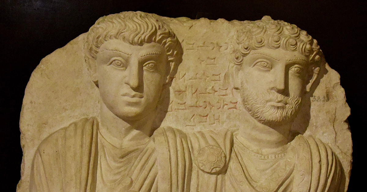 The inscription on this funerary relief says that the two figures are "Yedi Bel" and his son "Zabde'atach". Limestone. Roman Period, 200-273 CE. From Palmyra, in modern-day Syria. (Museum of Archaeology, Istanbul, Turkey).