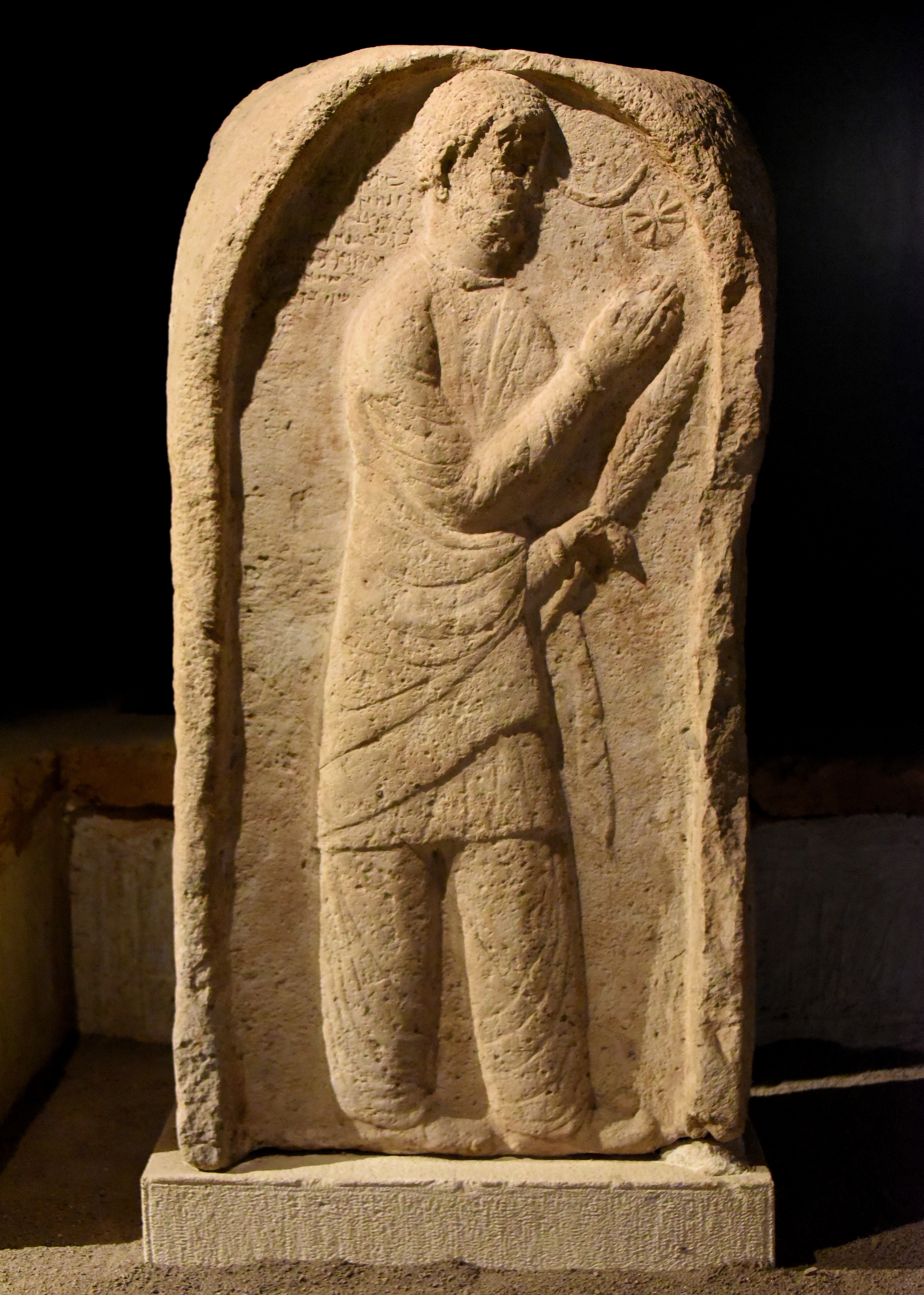 The Aramaic inscription says that this stele was erected in the 324th year of the Seleucid calendar (12-13 CE) by Sanashu's son, Re'n-tayar, the esteemed shepherd, for the goddess Sherua. Parthian, first century CE. From Ashur (Assur), Northern Mesopotamia, in modern-day Iraq. (Museum of Archaeology, Istanbul, Turkey).