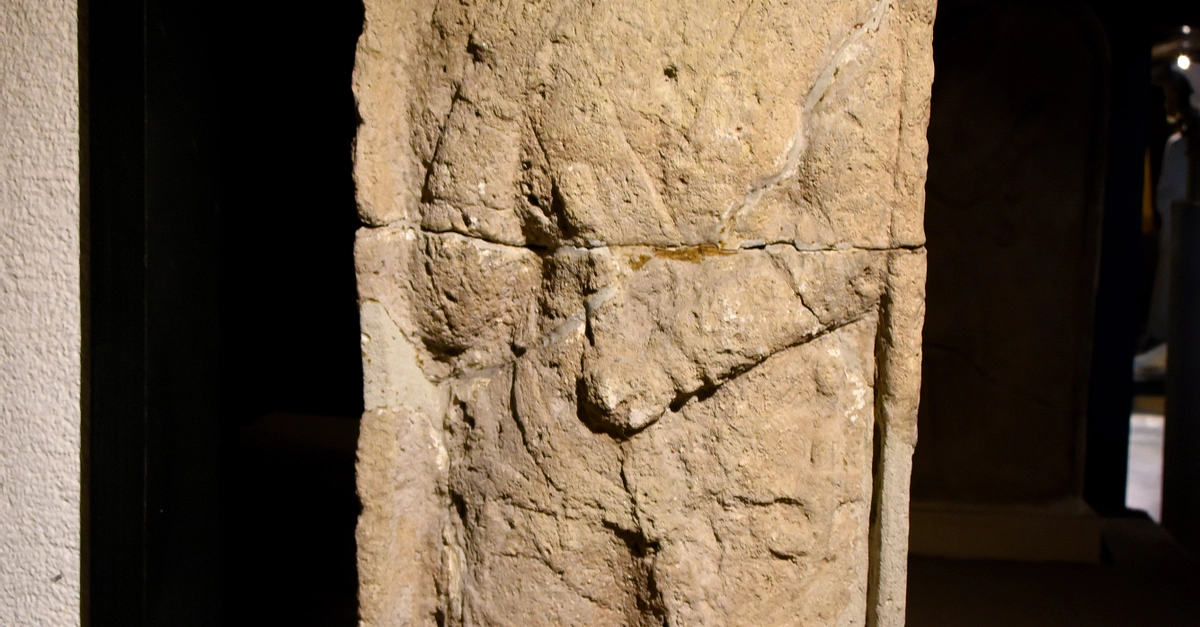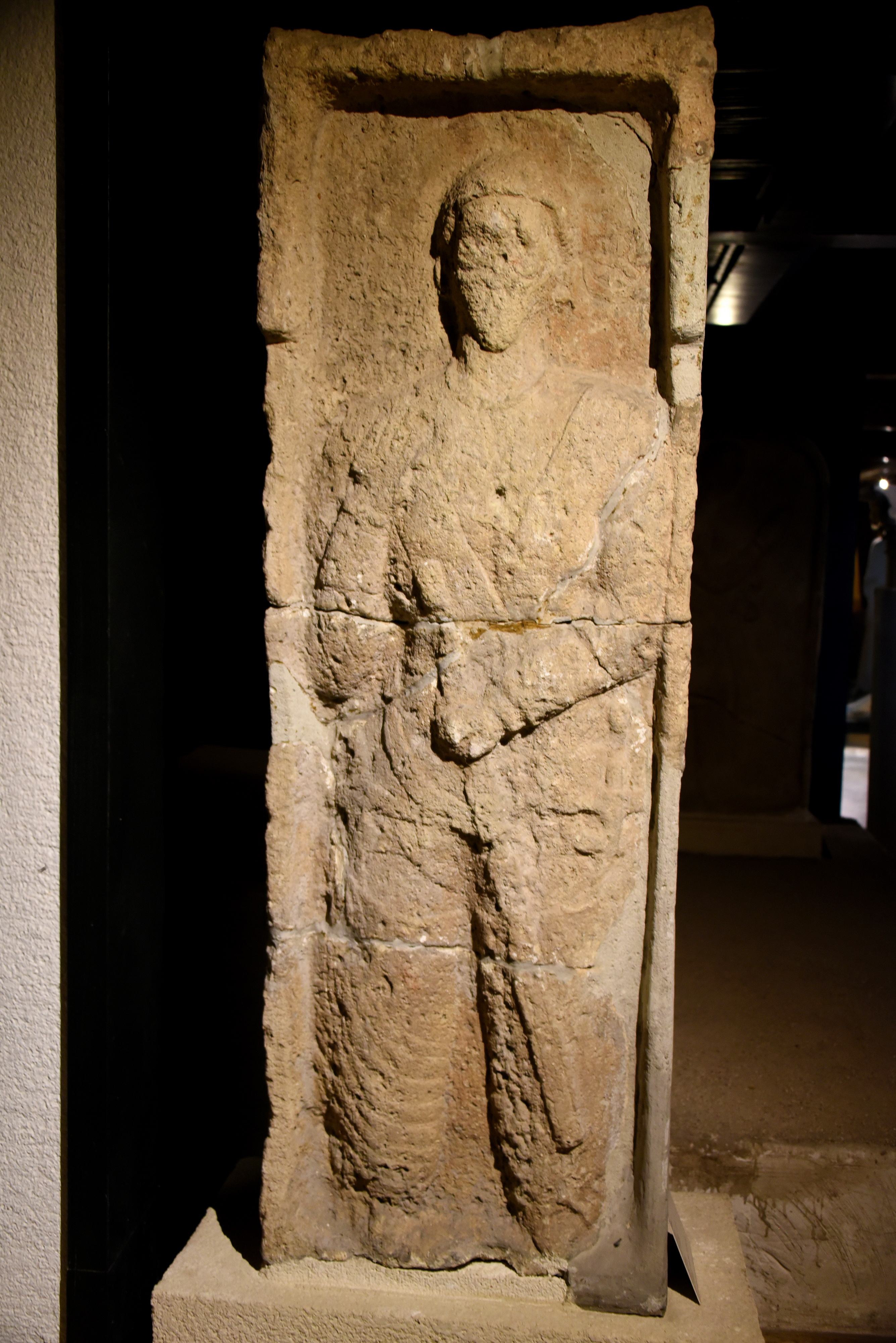 The man depicted on the stele was represented frontally. He raises his right arm while his left hand holds what appears to be a staff. A sword hangs down at his left waist. The divine emblems of Ishtar and Sin were placed above his left shoulder. Parthian, 1st century BCE to 1st century CE. From Ashur (Assur), Northern Mesopotamia, in modern-day Iraq. (Museum of Archaeology, Istanbul, Turkey).