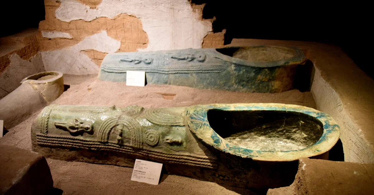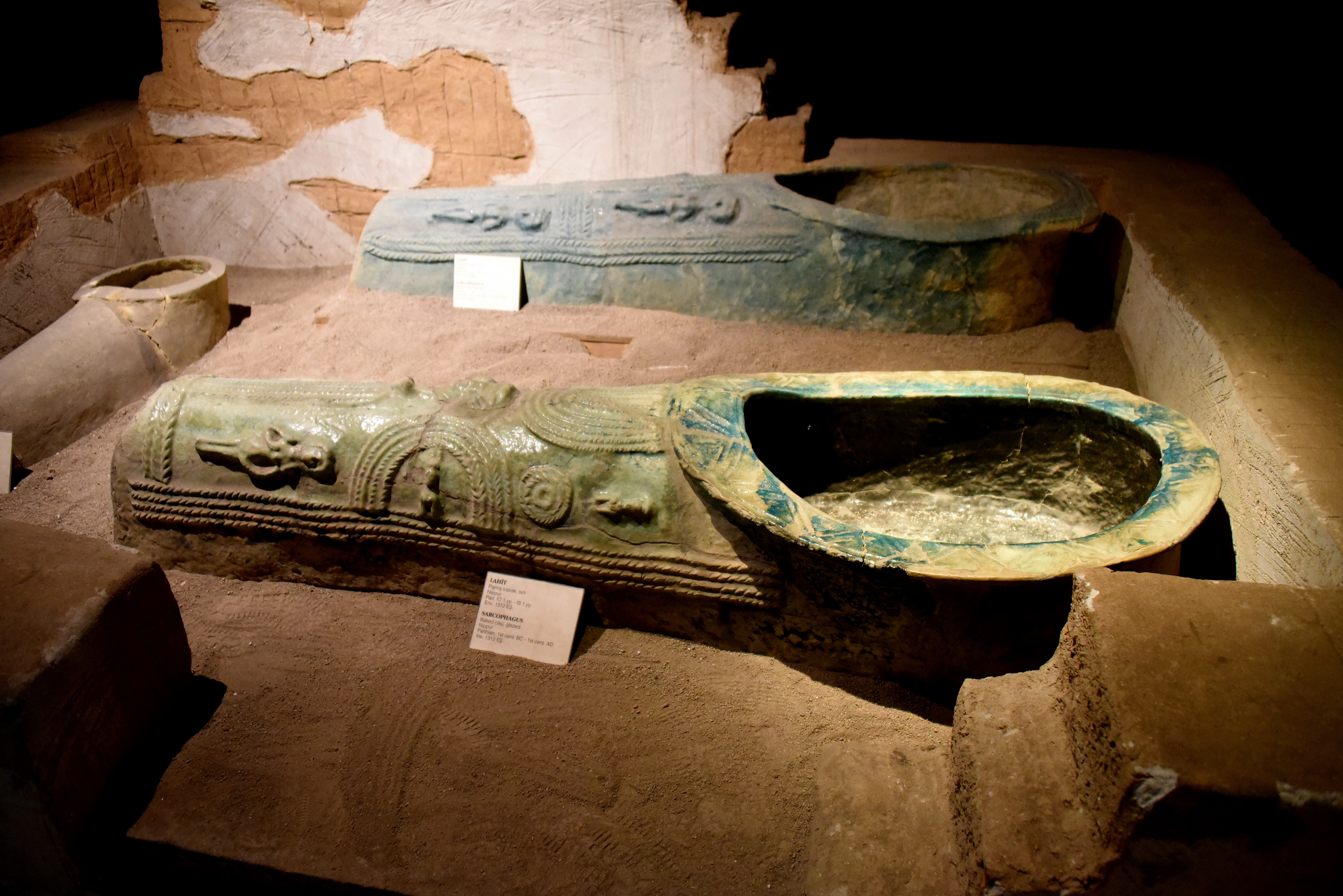 The smaller sarcophagus on the left belonged to a child. Baked clay and glazed. Parthian, 1st century BCE to 1st century CE. From Nippur, Southern Mesopotamia, in modern-day Iraq. (Museum of Archaeology, Istanbul, Turkey).