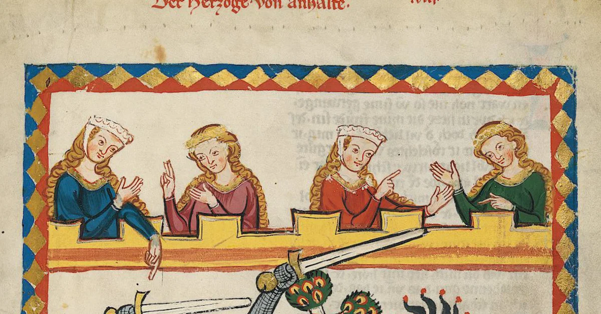 Page from the early 14th-century Codex Manesse - an illuminated book of poetry composed in Middle High German - depicting Henry I, Count of Anhalt participating in a tournament.