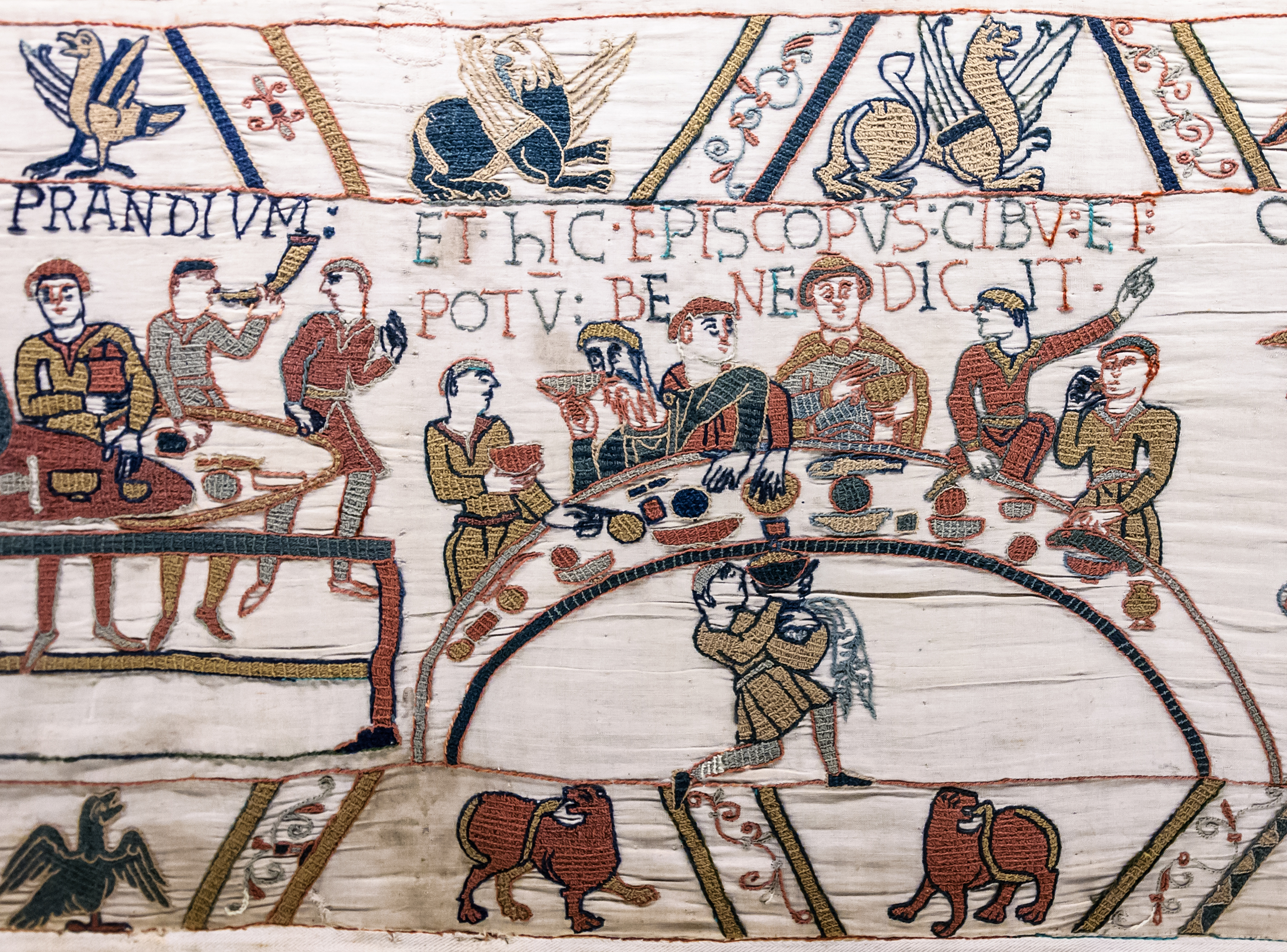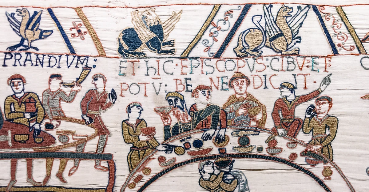A scene from the 11th century CE Bayeux Tapestry showing the celebratory feast of William the Conqueror after the Battle of Hastings in 1066 CE. In the centre is Odo, Bishop of Bayeux and probable patron of the tapestry. (Centre Guillaume le Conquérant, Bayeux, France)