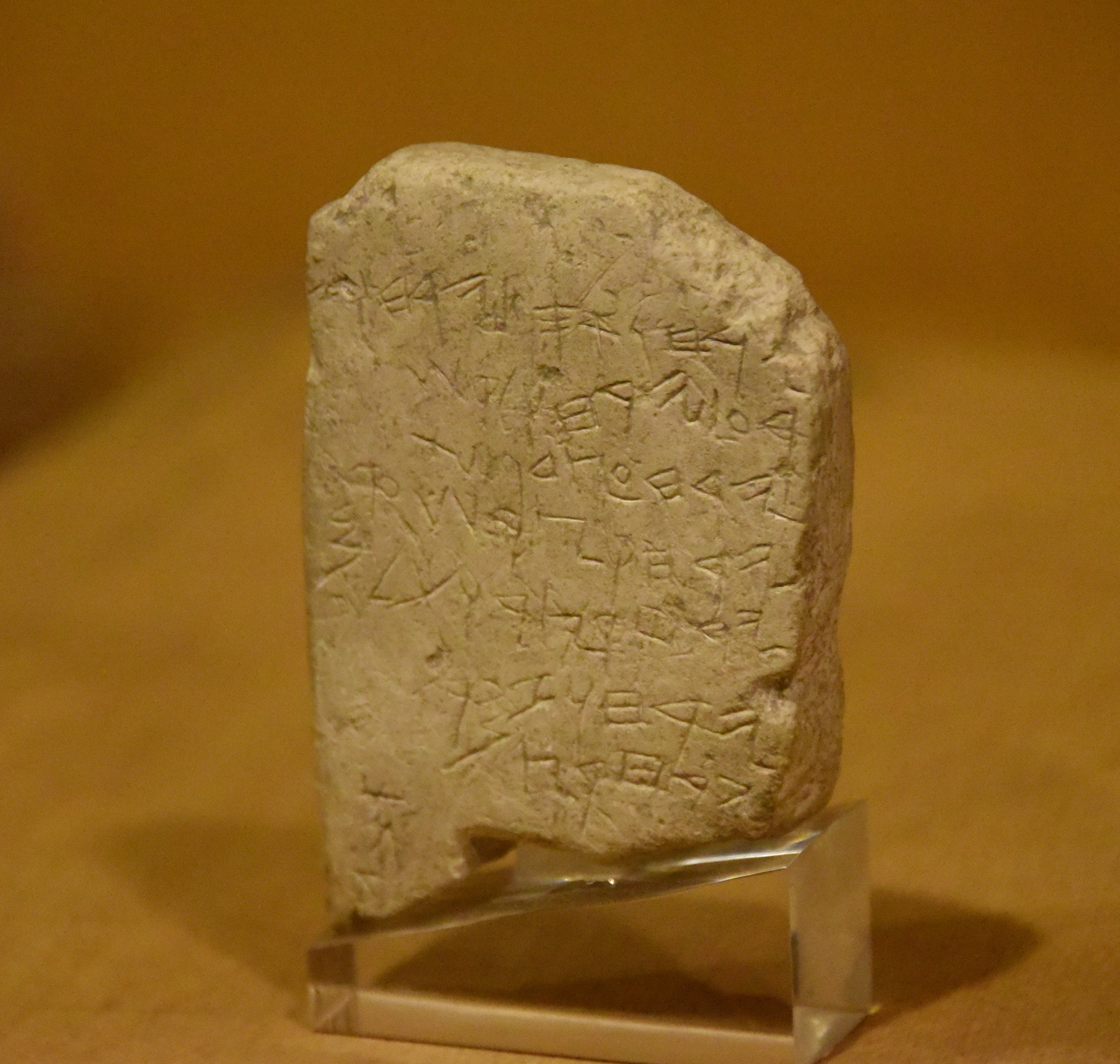 The Gezer calendar is regarded as the oldest Hebrew inscription as yet known. The inscription is scratched on a tablet of soft, chalky limestone and its lower part is broken and lost. The oblique fracture passes as square thought to have been made for a peg by which it was affixed to a wall. It has seven lines of horizontal writing and the eighth line was written vertically and only partly survives. Père Vincent* interprets the signs as follows: (1) Two months, late crops-Two months, (2) Sowing-two months, spring crops- (3) One month, cutting flax- (4) One month, harvest of barely- (5) One month, all the harvest- (6) Two months, fruit vines- (7) One month, summer fruits (8) Abi The eighth line "Abi" is interpreted as the name of the person who scribed the tablet. Some scholars believe that the inscription is not a calendar, but a record which gives a rotation of agricultural labors, written for some unknown administrative purpose. It is also thought that the tablet was a kind of a scrap material and some of the signs belonged to earlier writings, which the scribe himself corrected. Limestone. Circa 925 BCE. From Gezer (Tell el-Jezer), in modern-day State of Israel. (Museum of Archaeology, Istanbul, Turkey). *Pasinli, Alpay. Istanbul Archaeological Museums. Istanbul: A Turizm Yayınları, 2012.