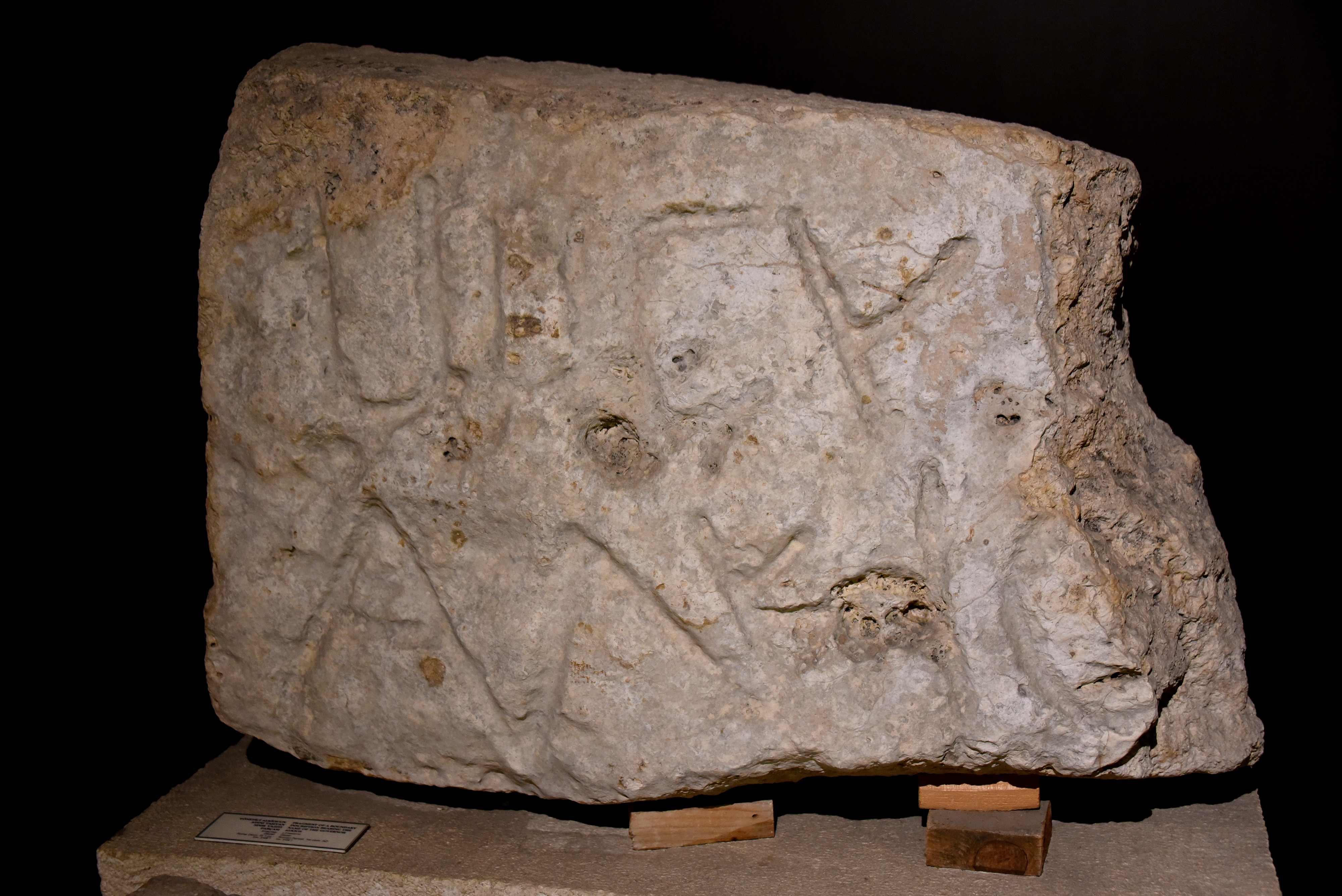 This is a fragment of a boundary description, which mentions the name of the Governor Alkios. Limestone. Roman Period, 1st century CE. From Gezer (Tell el-Jezer), in modern-day State of Israel. (Museum of Archaeology, Istanbul, Turkey).