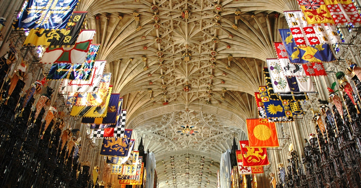The coats of arms of the knights of the Most Noble Order of the Garter in the order's religious headquarters, the mid-14th century CE Saint George's Chapel at Windsor Castle, England.