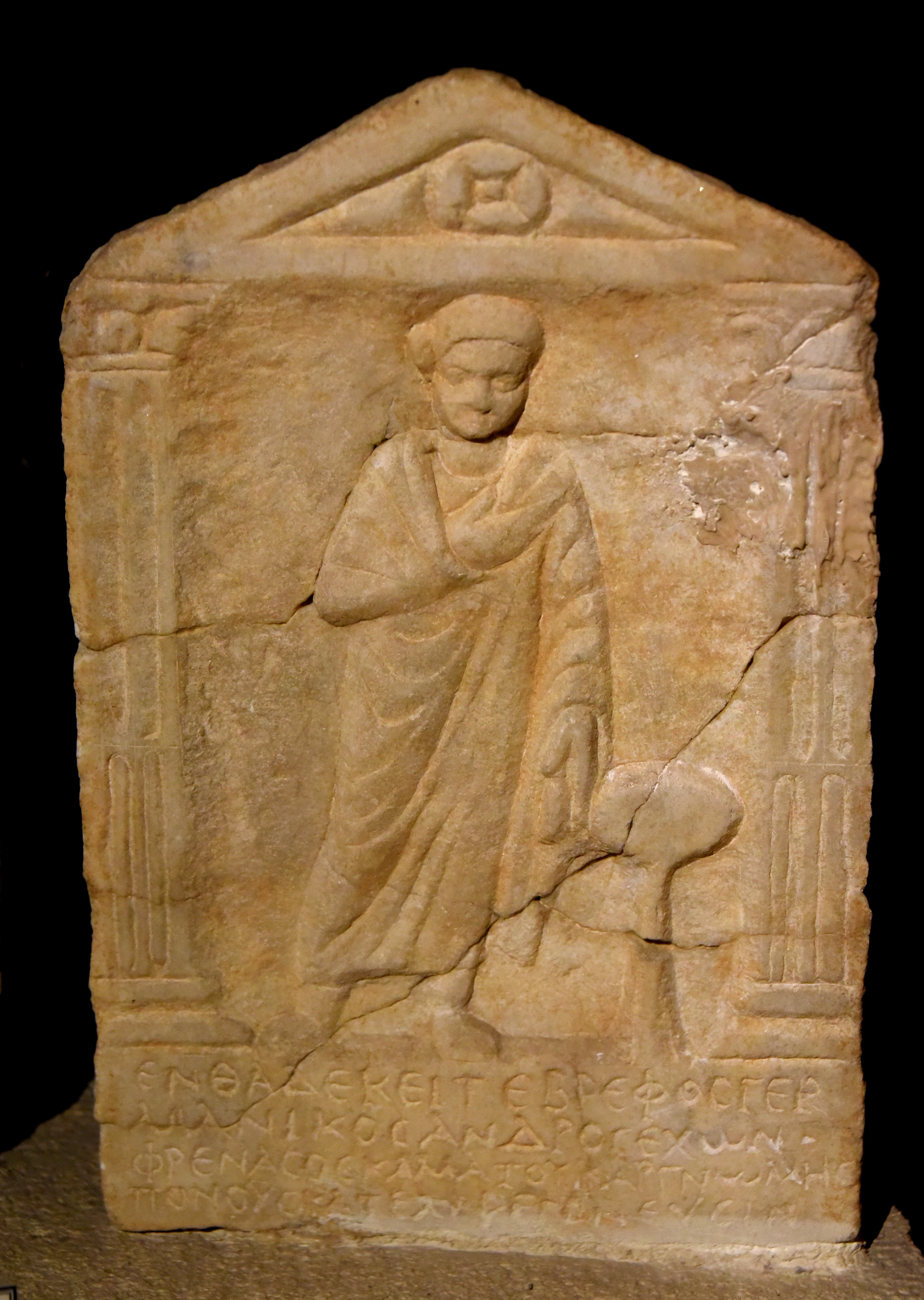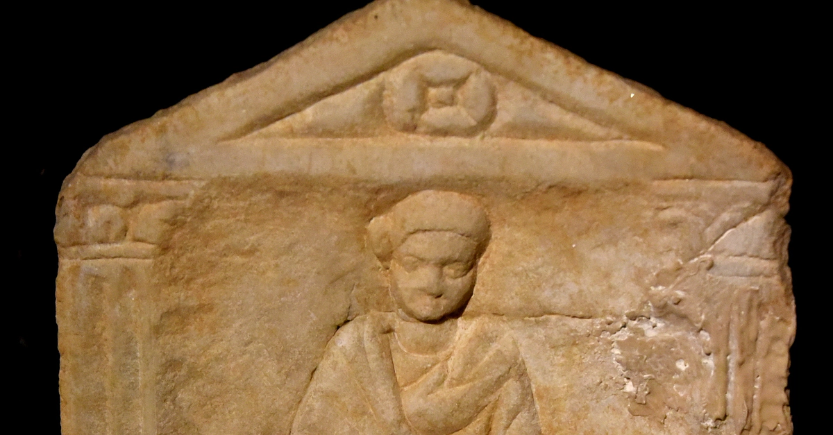 This is a marble funerary stele. The Greek inscription reads: "Here lies the baby, Germanicus Andros, who has a spirit. He left the troubles of wisdom and effort to his mother and father." From Aleppo, in modern-day Syria. Roman Period, 4th century CE. (Museum of Archaeology, Istanbul, Turkey).
