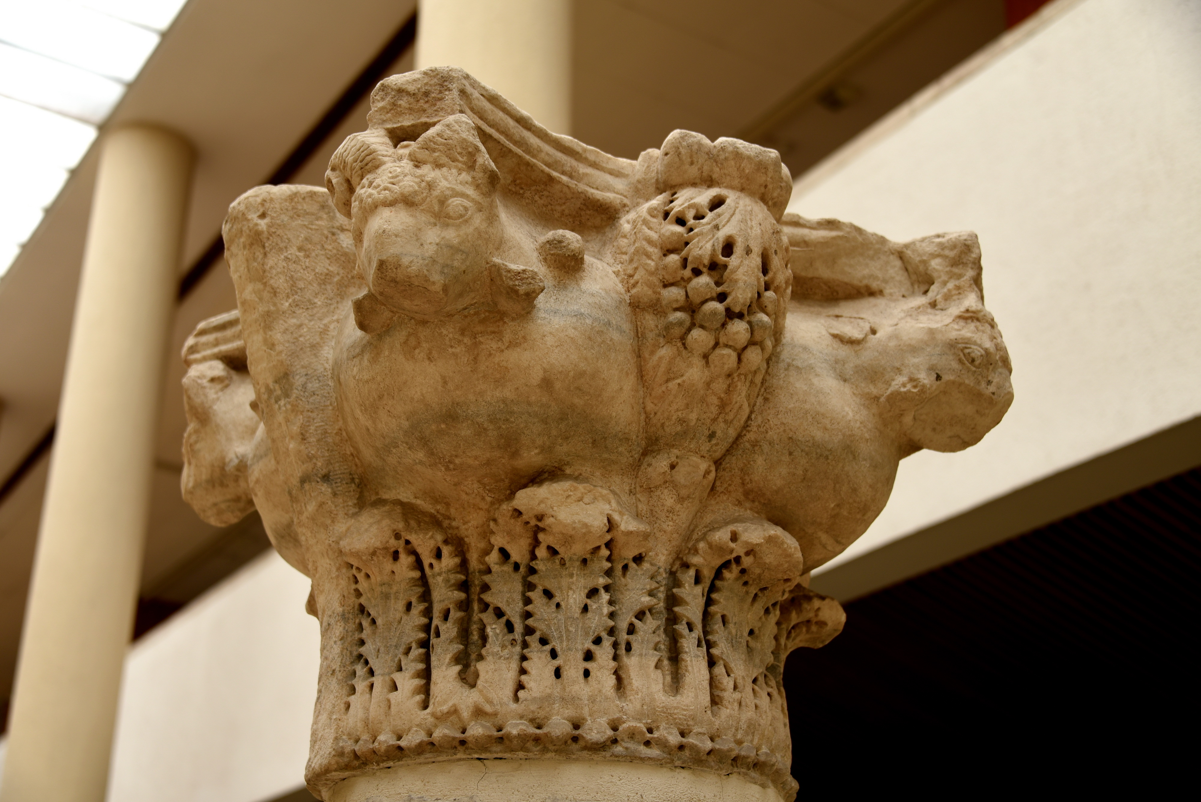 This marble capital is decorated with heads of rams. Second half of the 5th to the first half of the 6th century CE. From structures within the walls of the Topkapi Palace, Mangana Region, Gulhane, Istanbul, Turkey. (Museum of Archaeology, Istanbul, Turley).