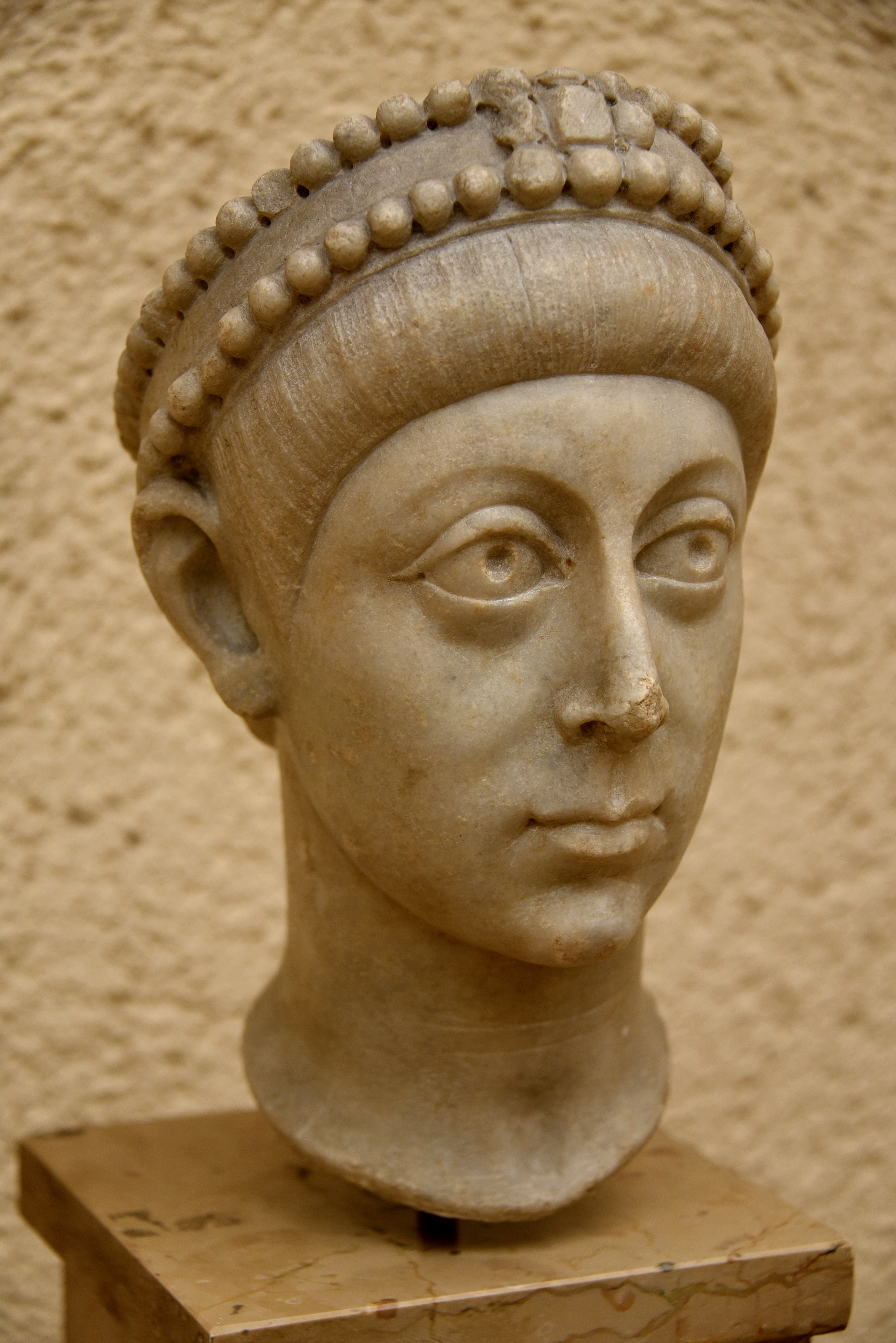 This marble head of the Roman Emperor Arcadius (reigned 395-408 CE) came from the foundation trench excavation of the Faculty of Letters-Beyazit, Istanbul, in modern-day Turkey. Late 4th century CE. The head was crowned with a double-string of pearls flanking a band of precious stones and adorned with a cameo of pearls in the center. The face is clean and shaved, the pupils were drilled, and the neck is long and thin. (Museum of Archaeology, Istanbul, Turley).