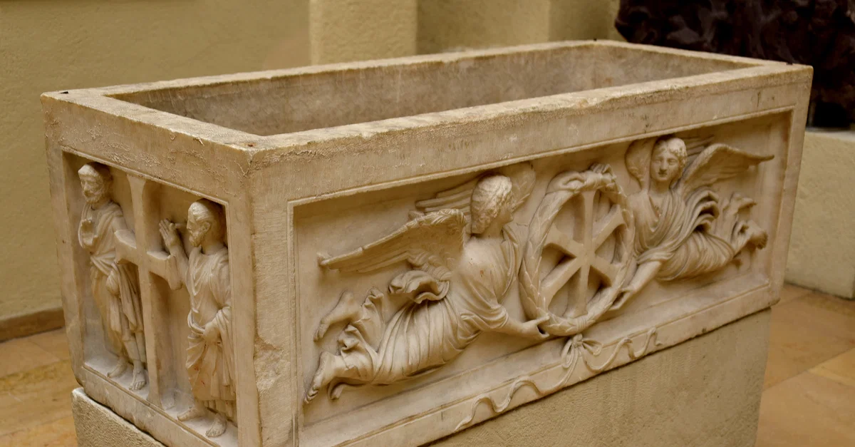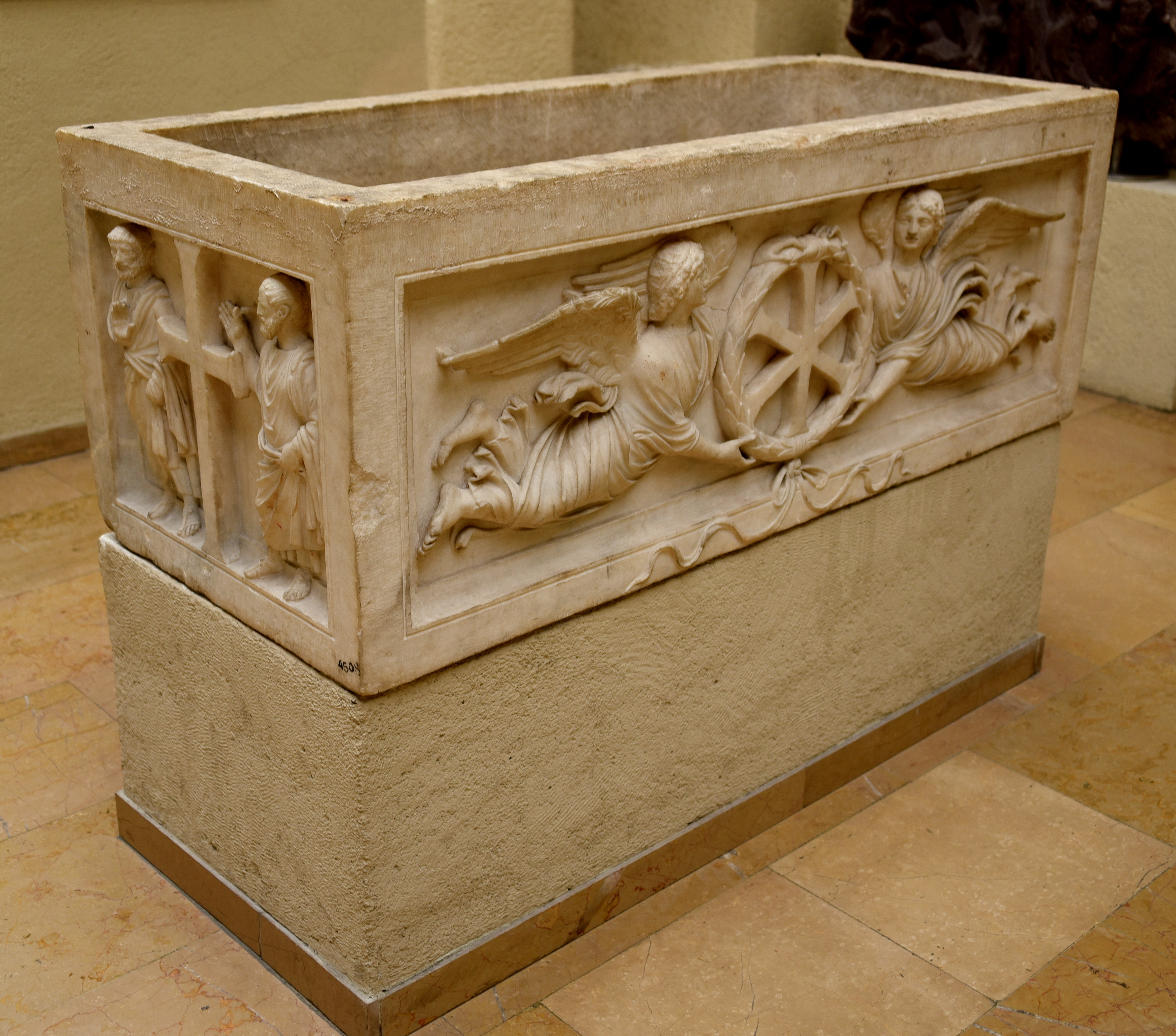 "This marble sarcophagus is thought to have belonged to a member of the royal family and has come to be known as the "Prince Sarcophagus". On each of its long sides, a pair of angles in flight carrying the circular monogram of Christ in a garland and is represented in relief. On each short side, a pair of bearded apostles flanks a large cross."* Second half of the 4th century to early 5th century CE. From the Imperial Cemetry beside the Church of the Holy Apostles, Sarıgüzel, Istanbul, in modern-day Turkey. (Museum of Archaeology, Istanbul, Turley). *Pasinli, Alpay. Istanbul Archaeological Museums. Istanbul: A Turizm Yayınları, 2012.