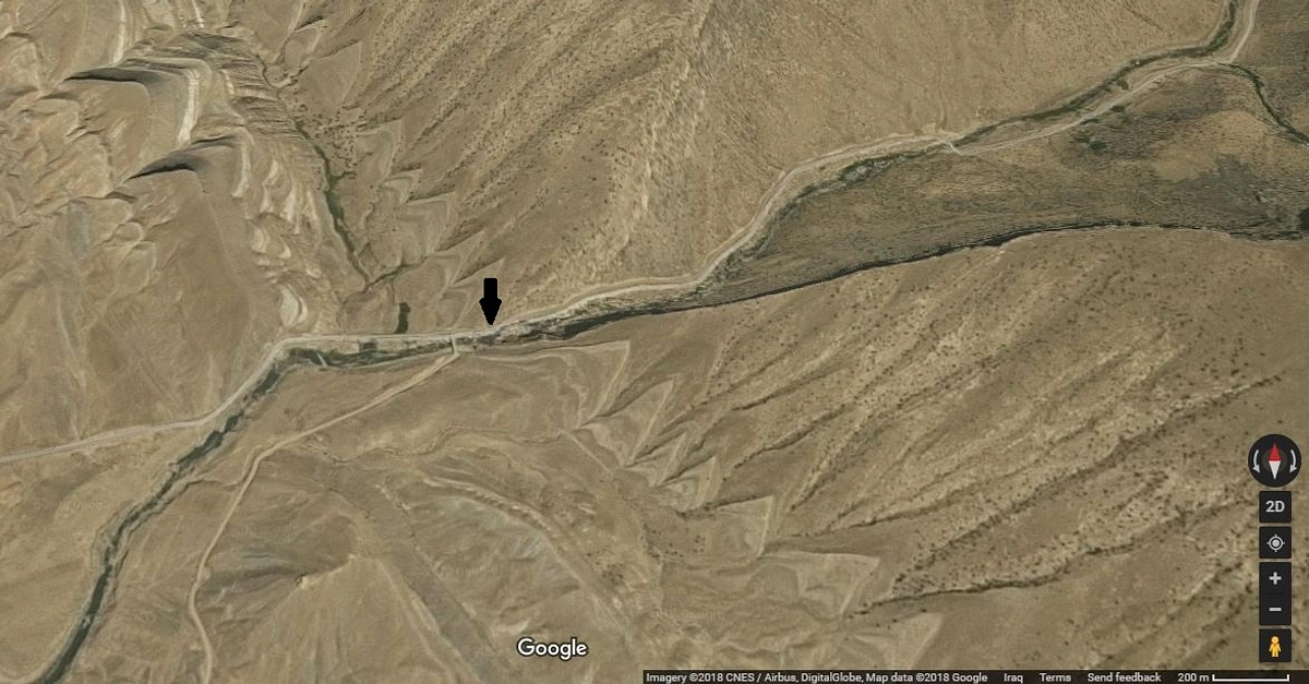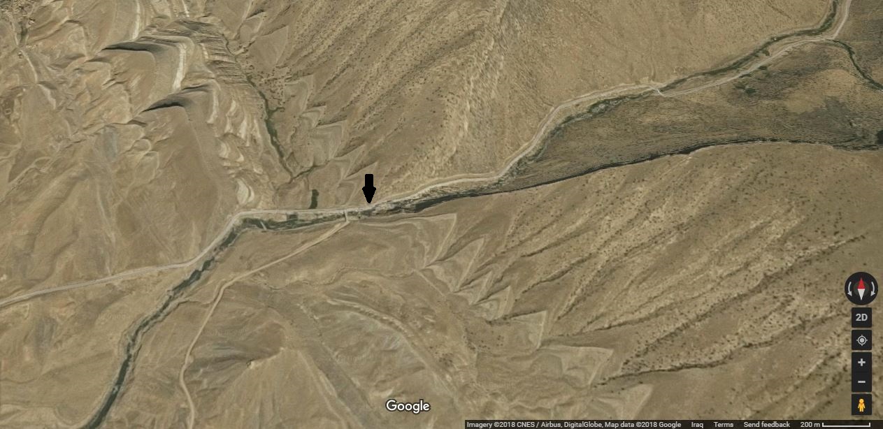 Google Earth's view of Darband-i Basara (Basara Gorge). The black arrow is where a rock relief lies. The gorge transects the anticlines of the upper part of Qaradagh Mountain Ridge. The rock relief is thought to be Lulubian and dates to the late 3rd millennium to early 2nd millennium BCE. Sulaymaniyah, Kurdistan, Iraq.