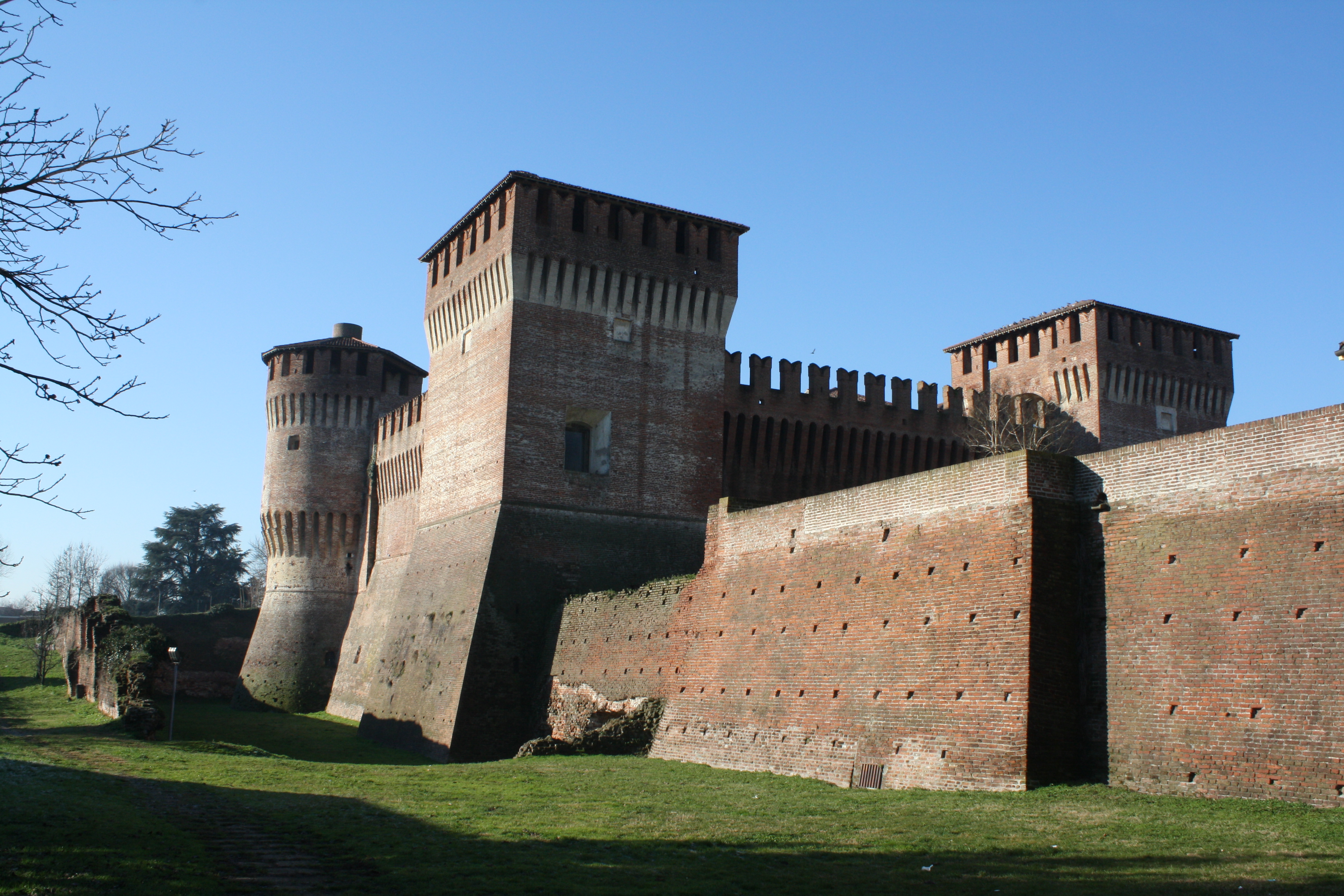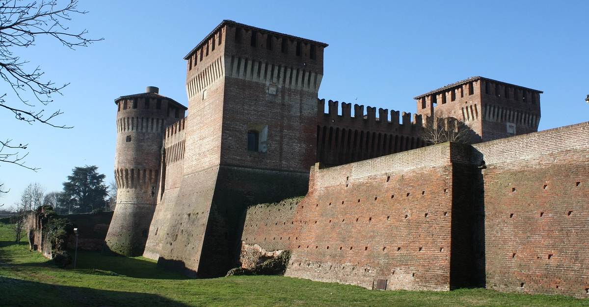 Soncino Castle, Lombardy, Italy. First built in the 10th century CE and then rebuilt in the 13th century CE. Here can be clearly seen the massive angled additional base to the walls known as a talus which increased the difficulty in climbing and dismantling them by attackers.