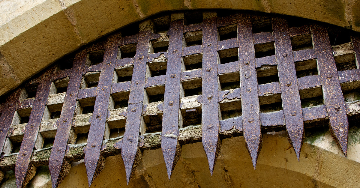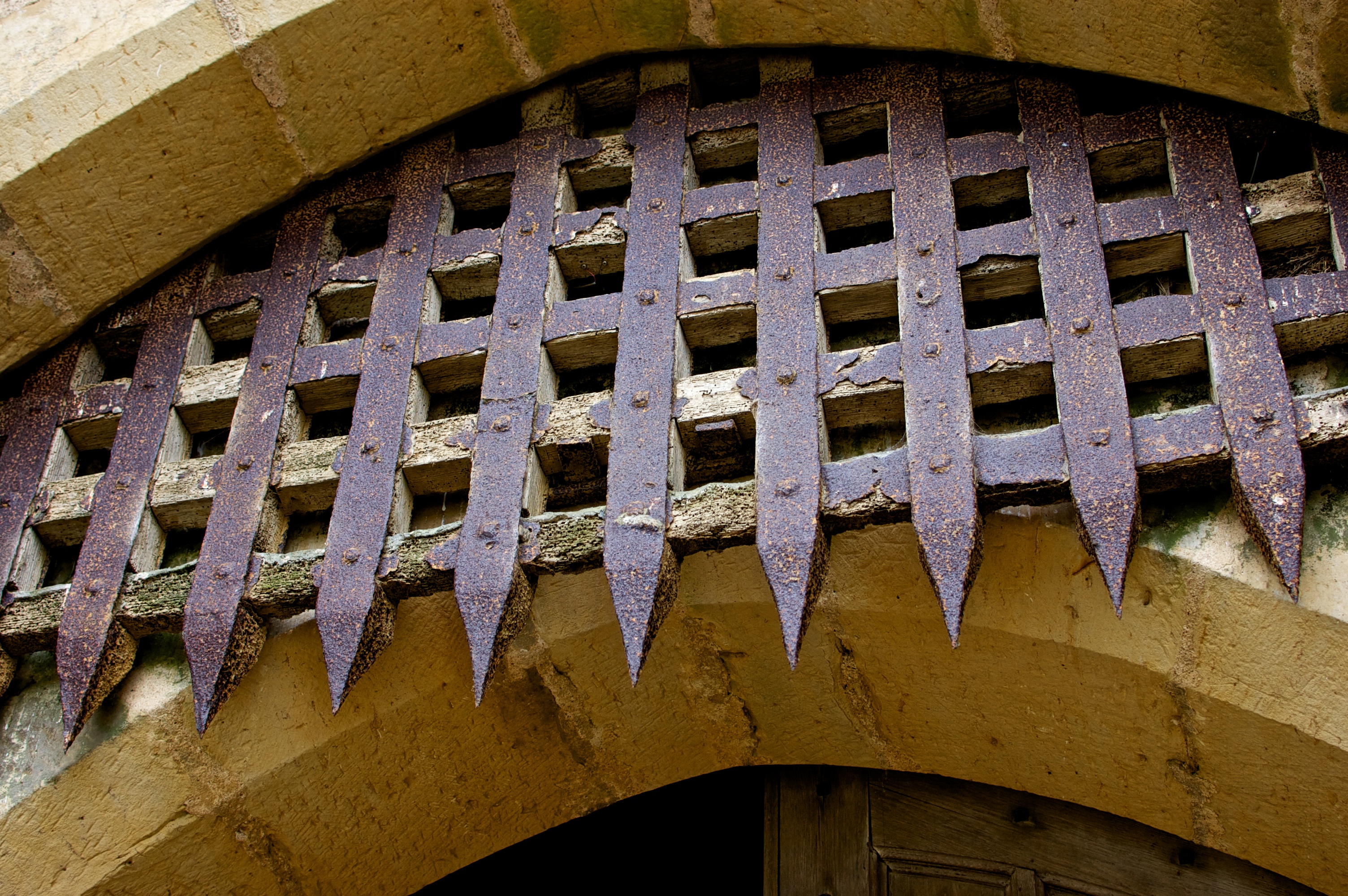The wood and iron portcullis of Bodiam Castle, East Sussex, England. 14th century CE.