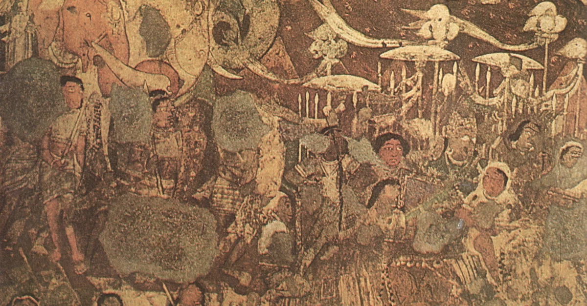 A section of the mural at Ajanta in Cave No. 17. depicts the 'coming of Sinhala'. The prince (Prince Vijaya) is seen in both of groups of elephants and riders. This mural also depicts the soldiers of the Gupta/Vakataka period (4th to 6th centuries CE). Location: Ajanta Caves, Aurangabad, Maharashtra, India.