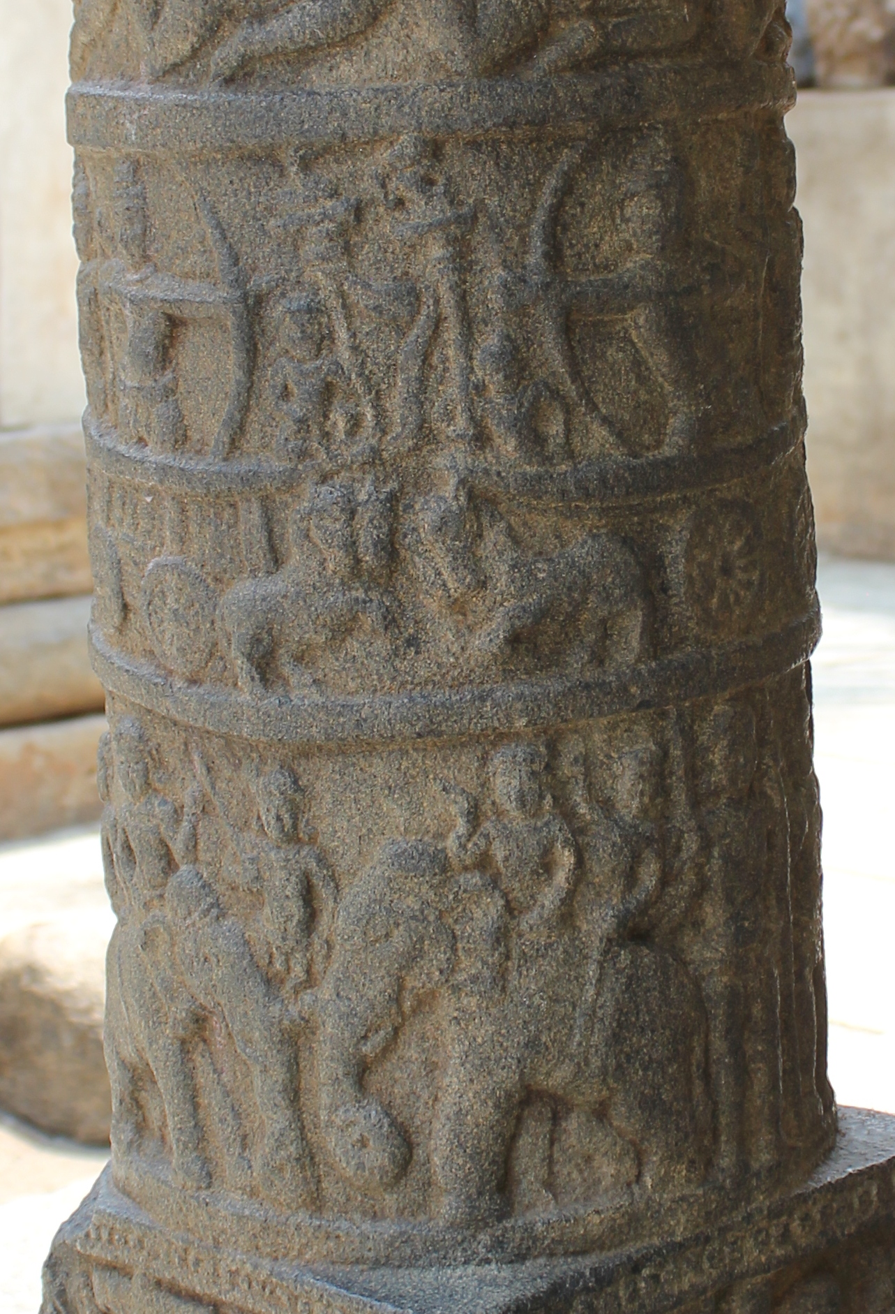 This is a contemporary depiction of the Battle of Takkolam (949 CE) as it is shown on a pillar of a temple built by Butuga II (939-960 CE) of the Western Ganga dynasty (a Rashtrakuta empire vassal) as a fitting finale to his victory over the Cholas of Tanjore at the Takkolam battle. The reliefs on the circular pillars of the Nandi Mandapa depict the defeat of Chola commander Rajaditya by Butuga Il who fought for the Rashtrakutas. Location: Arakeshwara temple (also spelt Arakeshvara or Arakesvara) in Hole Alur, Chamarajanagar district, Karnataka state, India.