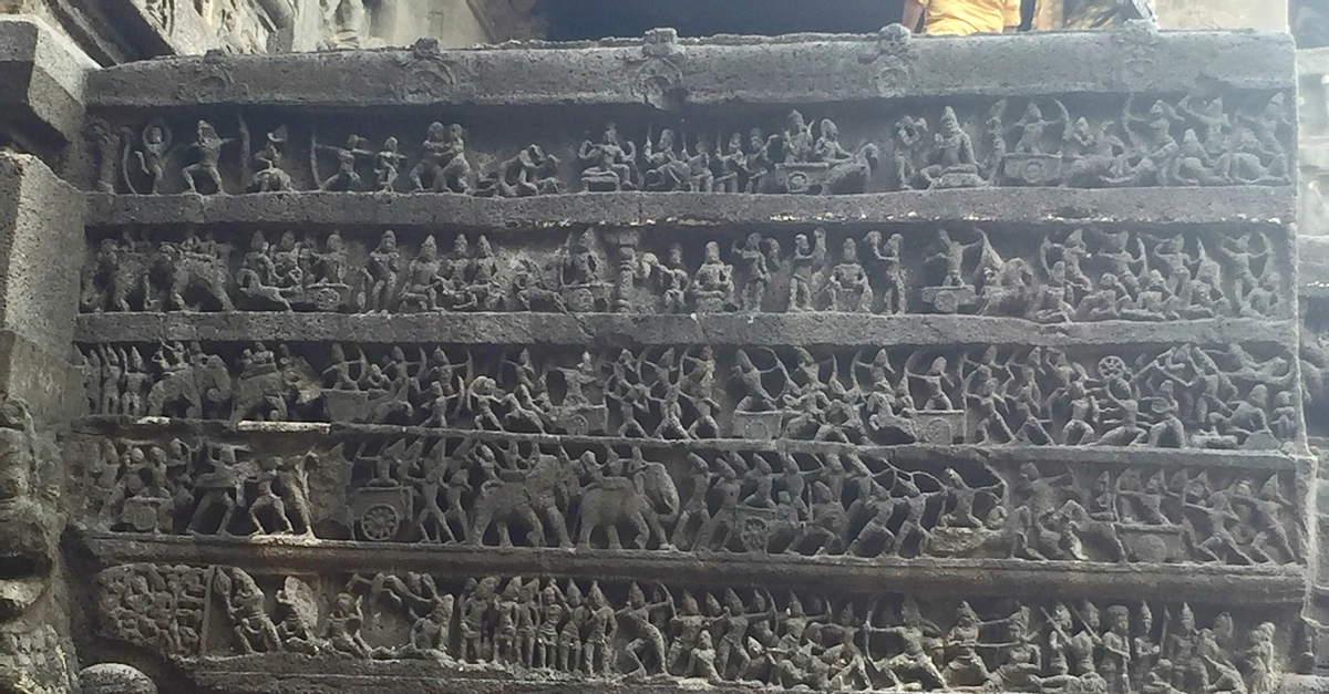 This war scene shown in a temple frieze in the Kailashanatha Temple built by the Rashtrakuta emperor Krishna I (756-773 CE) depicts the Mahabharata war. The soldiers' arms and armour however, belong to the period of the imperial Rashtrakutas (eighth to tenth centuries CE). This scene thus shows how the Rashtrakuta army, including the war elephants, looked like.