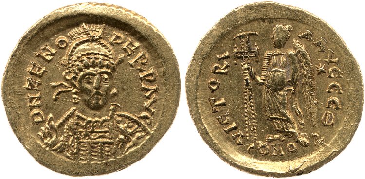 Gold coin depicting Emperor Zeno (474-491 CE), minted in Constantinople. British Museum