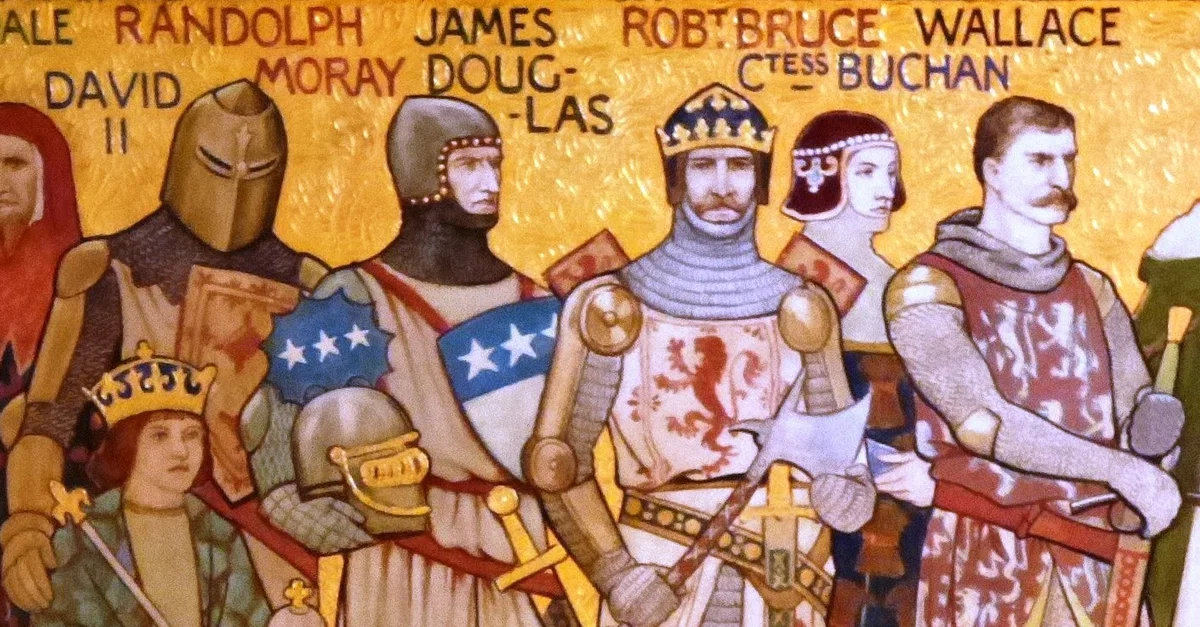 Sir James Douglas, aka 'Black Douglas' (c. 1286-1330 CE), a Scottish knight who fought for his country's independence from England. He is here shown with fellow fighters Robert Bruce and William Wallace. (Entrance hall frieze by William Hole, Scottish National Portrait Gallery, Edinburgh)