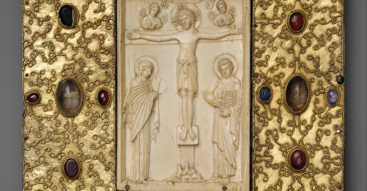 A Byzantine book cover with an ivory icon of the crucifixion. Gilded silver with crystal, glass and sapphire cabochons. Constantinople, 11th century.