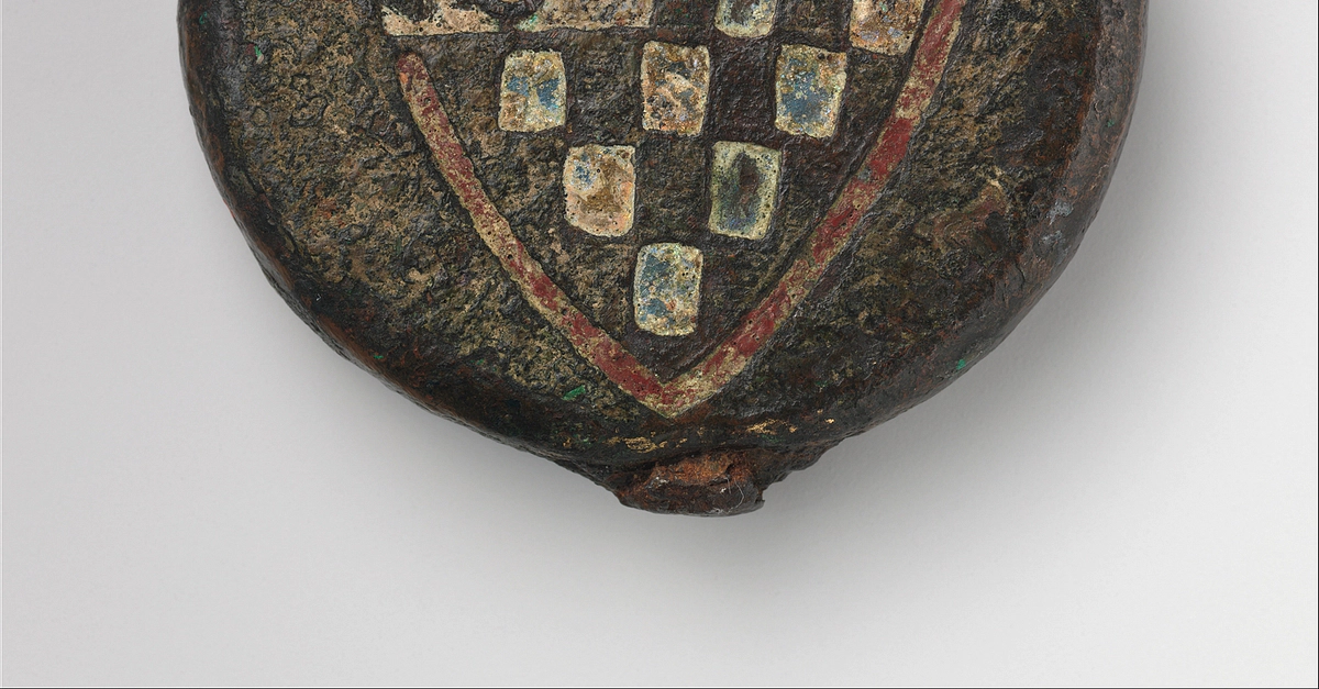 Dating to 1190-1250 CE, this iron sword pommel is decorated in copper, gold, and enamel. It depicts the coat of arms of Pierre de Dreux, Duke of Brittany (1187-1250 CE). Measures approximately 6 cm in diameter and 1 cm thick and weighs 227 grams.