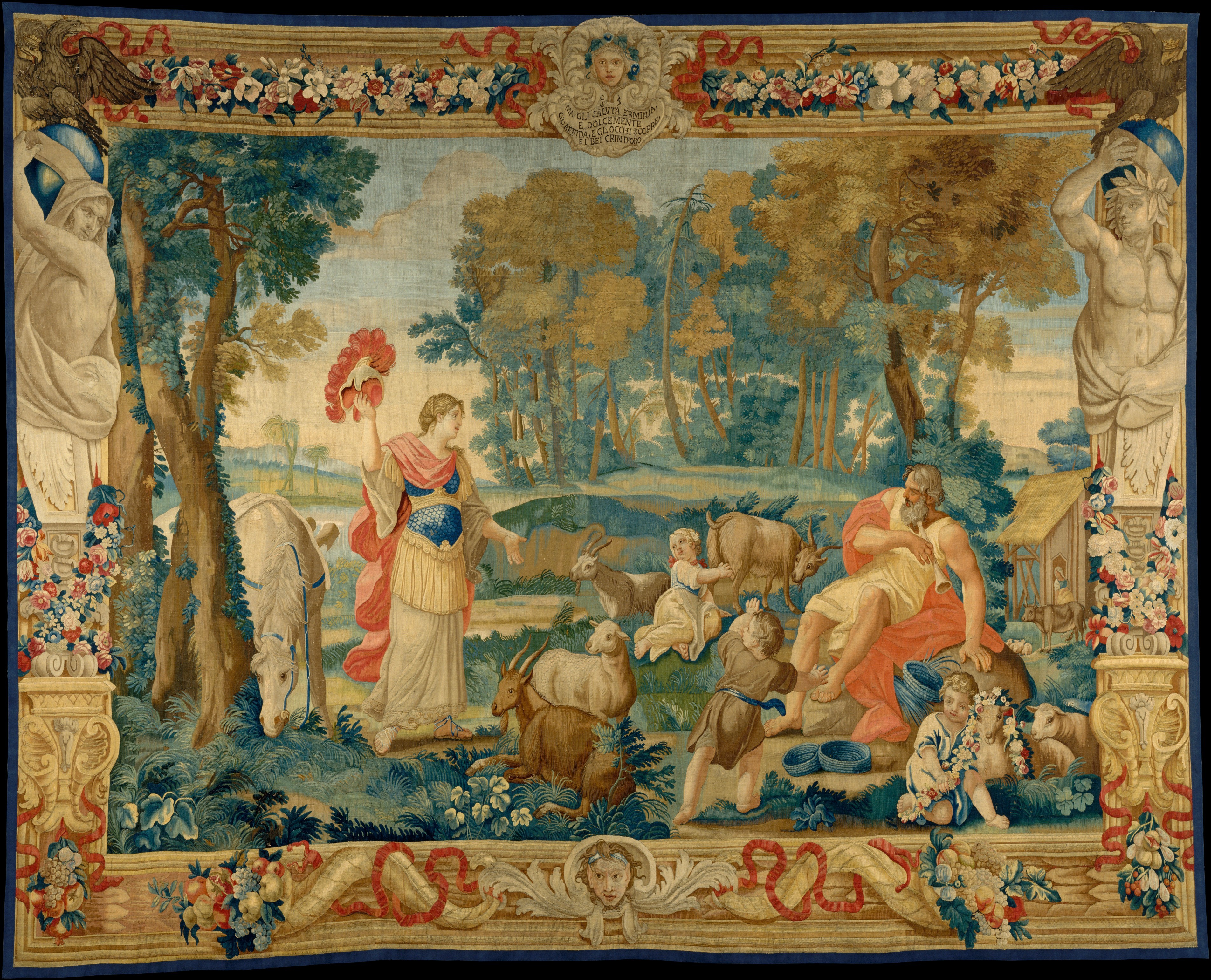 Designed c. 1689-1693 CE by Domenico Paradisi on commission by Cardinal Ottoboni, this tapestry depicts Erminia and the Shepherd. It is one of a series of tapestries from Gerusalemme Liberata (Jerusalem Delivered) portraying a romanticised view of the First Crusade (1095-1102 CE).