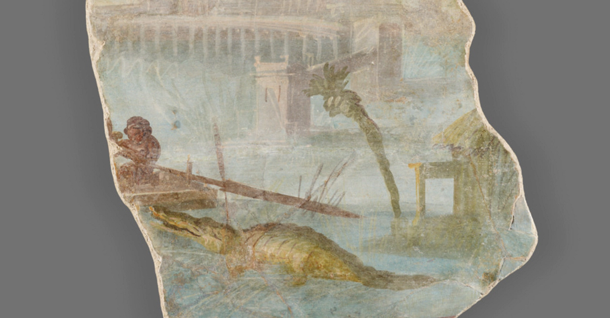 This fragment of a Roman fresco was made in Italy c. 1-79 CE and depicts a Nilotic setting. Images of scenes set on the Nile became increasingly popular after the 1st Century BCE as a kind of Egyptomania gripped the Roman Empire. This scene portrays a crocodile approaching a small figure in a boat, possibly a pigmy, with a thatched hut and colonnaded bridge in the background. The fragment is part of the collection of the J. Paul Getty Museum. Digital image courtesy of the Getty's Open Content Program.