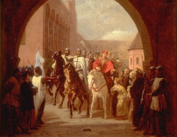 A 19th century CE painting by Carl Steffeck depicting Teutonic knights entering the Prussian castle of Marienburg.