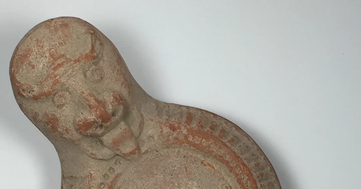 This is a terracotta oil lamp with orange clay and dull orange slip. It features a hollow handle in the form of a gorgon's head. This is a decorative example of the type of oil lamp that was used to light one’s home. 2nd century CE. Provided as part of the Traveling Classroom History Exhibit by the History in Your Hands Foundation.