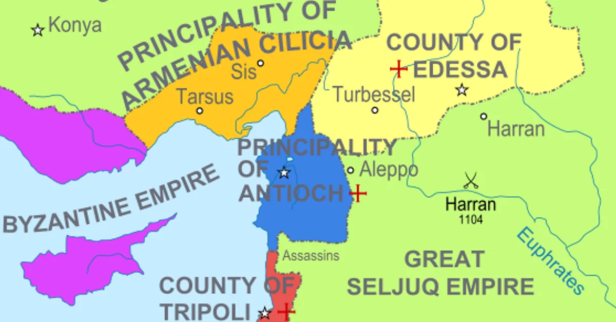 This map of the Near East in 1135 CE shows four Crusader States (marked with red crosses) in relation to other powerful kingdoms in the period between the first and second crusades.