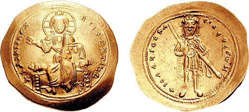 Gold histamenon coin of Byzantine emperor Isaac I Komnenos (r. 1057-1059 CE), who is pictured on the reverse (on the right), crowned and in military dress, while the obverse shows Christ enthroned. (Classical Numismatic Group, Inc. http://www.cngcoins.com)