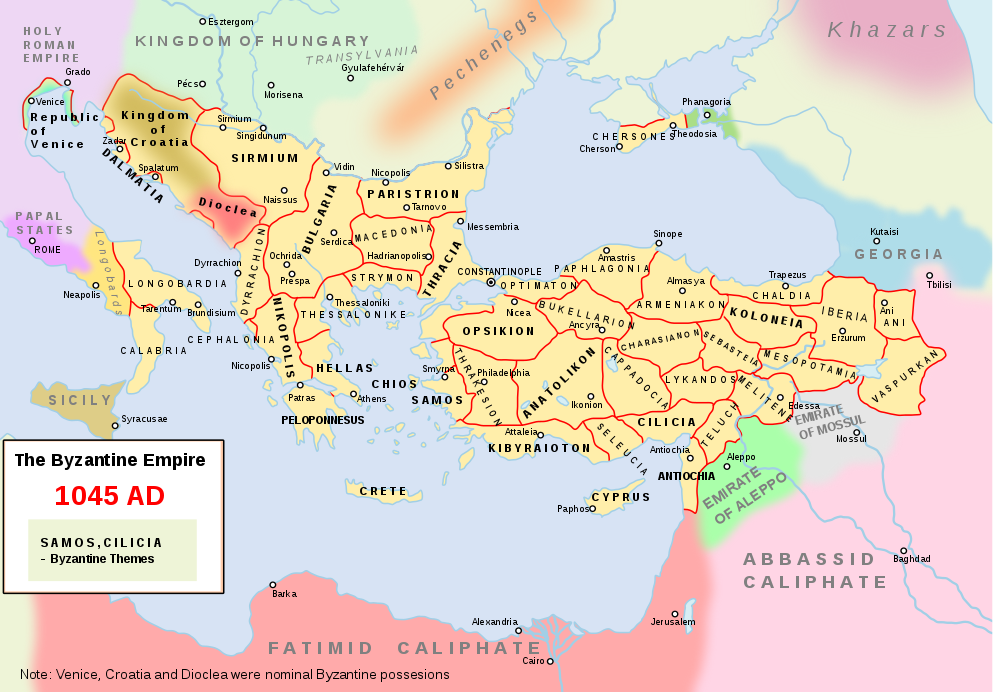 Map depicting the Byzantine Empire in 1045 CE showing its administrative divisions and its neighbours.