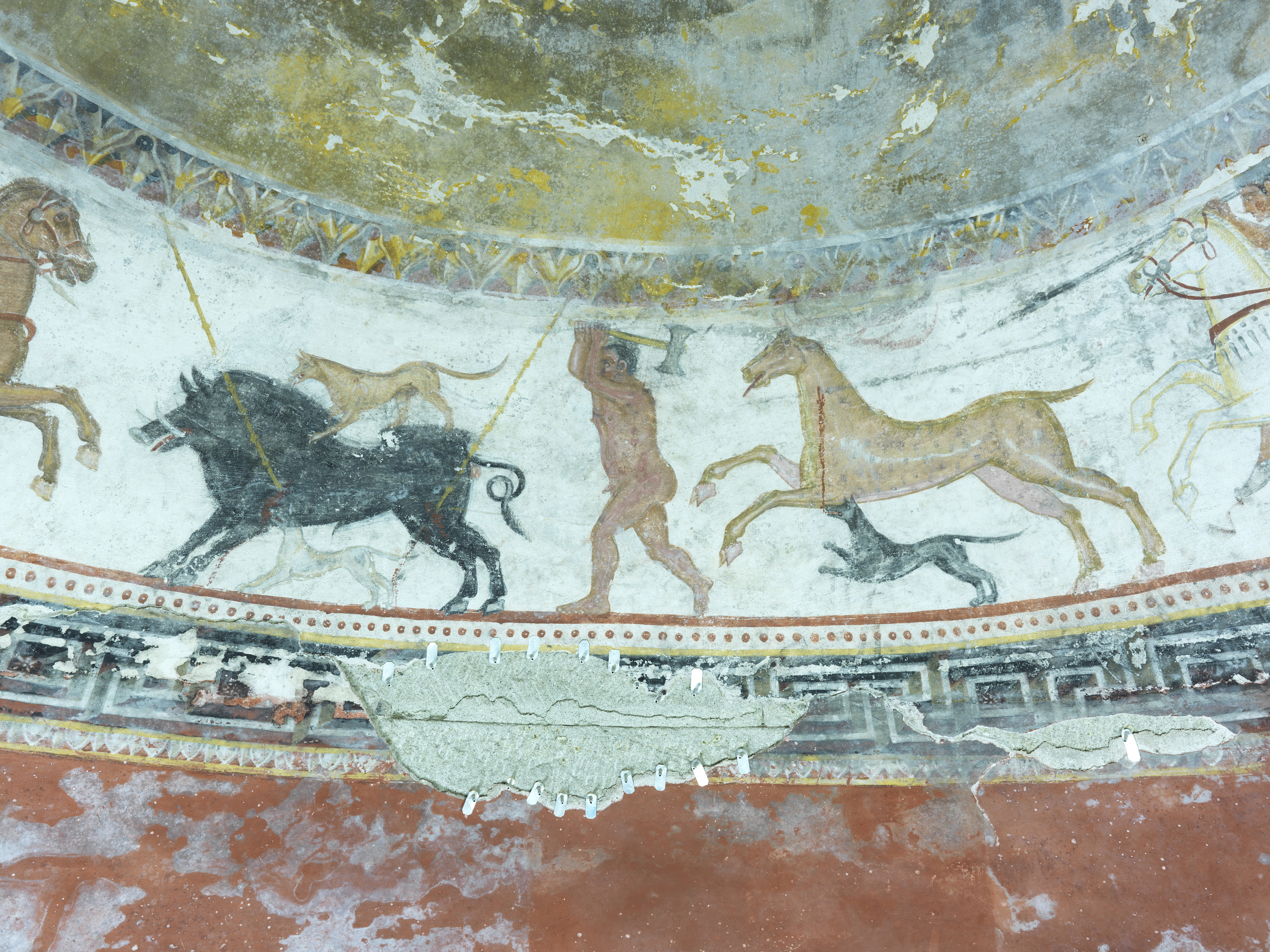 A detail of a painted dromos and dome camera from a tumulus near Aleksandrovo village, Haskovo district, Bulgaria. The dromos has battle scenes while the burial chamber has a hunting scene, unfolded in a circle, and in the lower register of the room the scene is of a symposium. End of the 4th century BCE. Photographer: Marin Karavelov