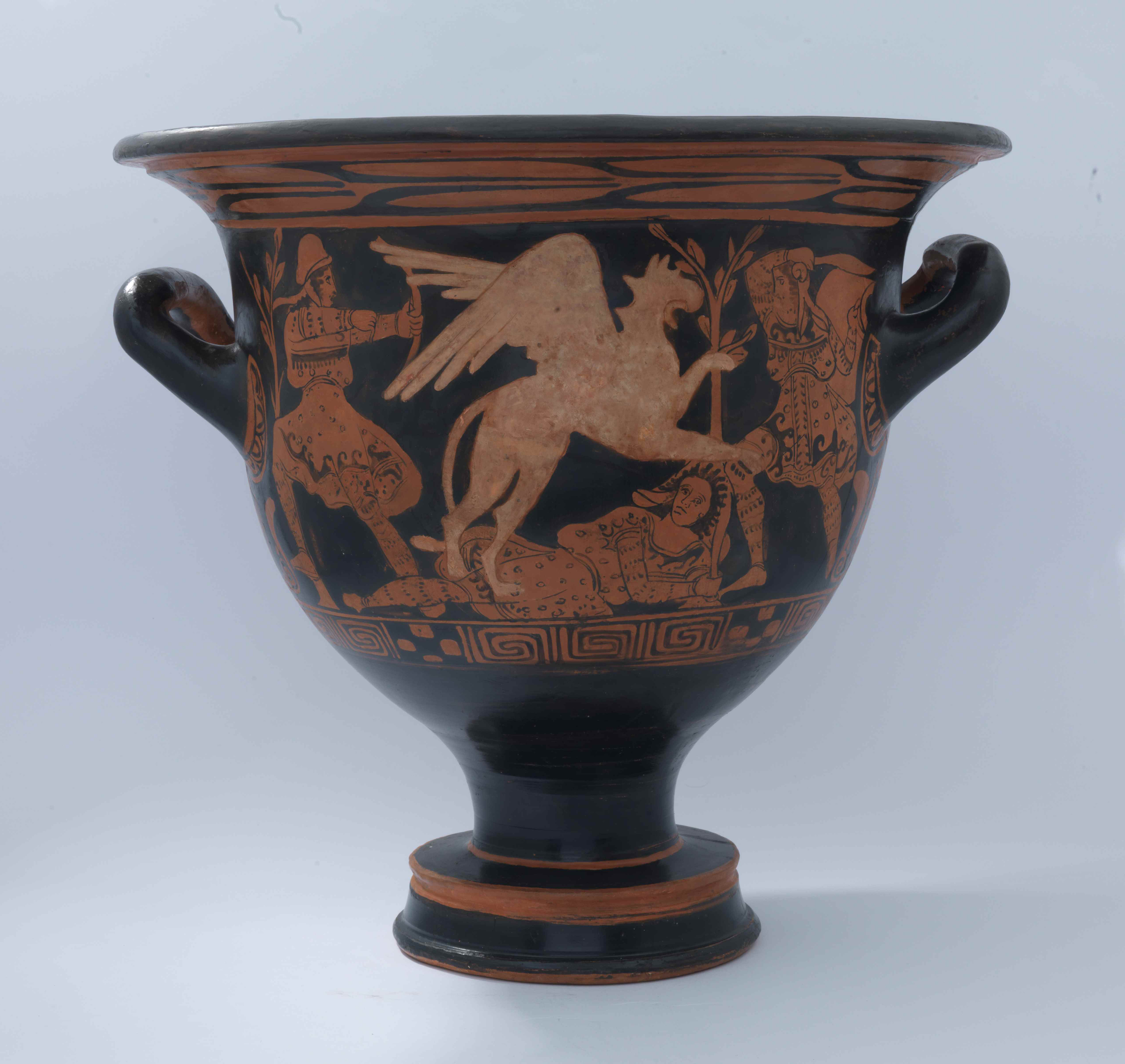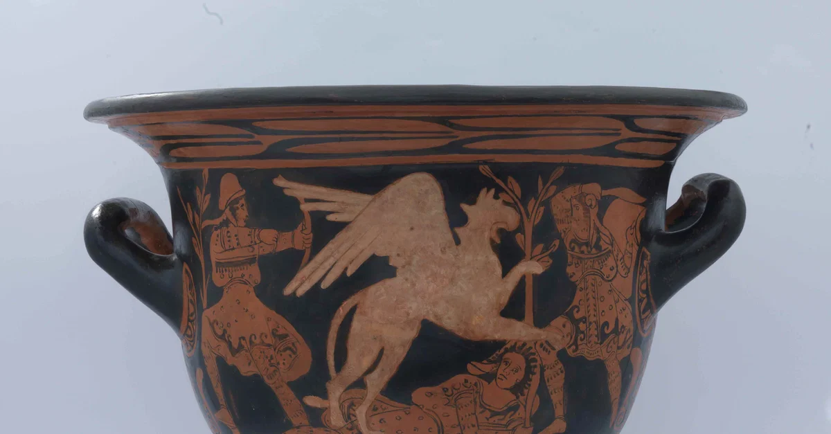 A red-figure bell krater showing a griffin or gryphon attacking Amazons. First half of 4th century BCE.