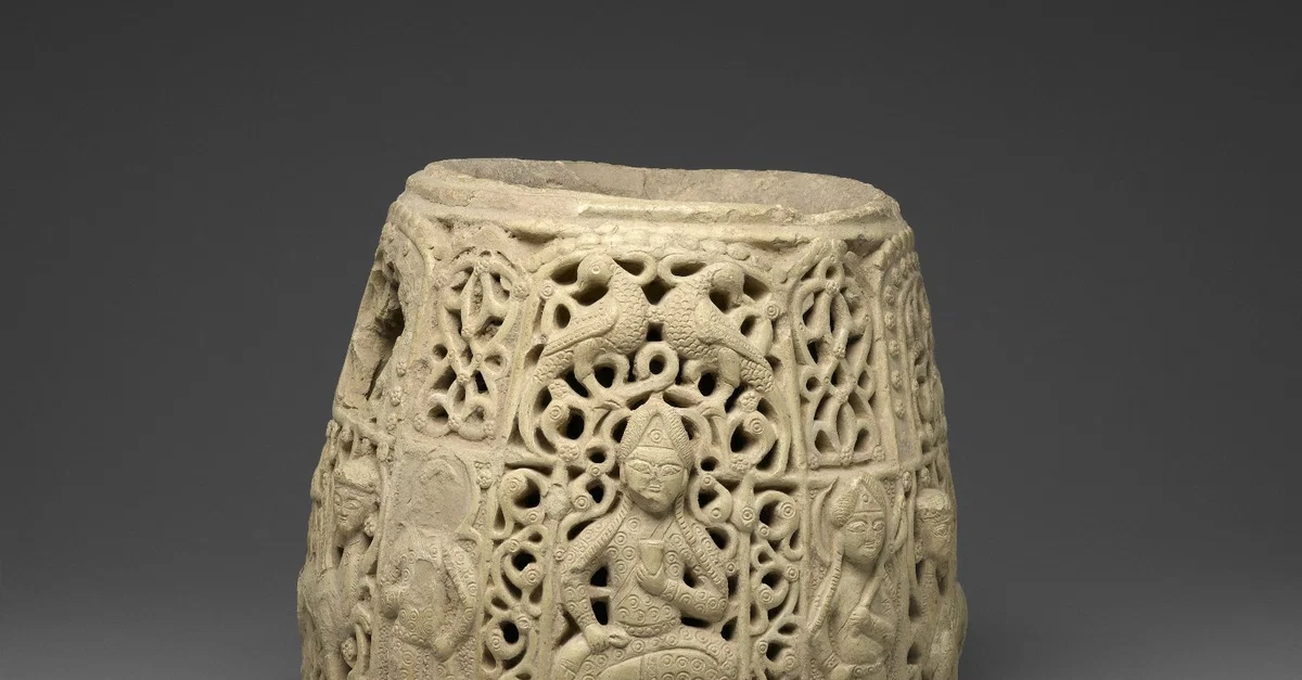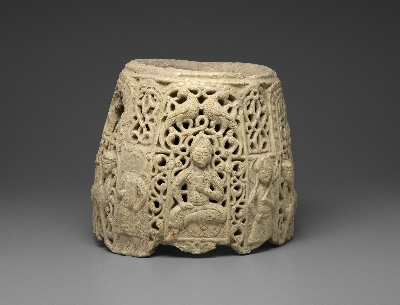 Made of unglazed ceramic, this top portion of a water jug depicts two Seljuk guards flanking a seated figure, possibly a sultan. Dates to the late 12th to early 13 century CE. Measures approximately 30 x 36 x 36 cm. (Brooklyn Museum, New York)