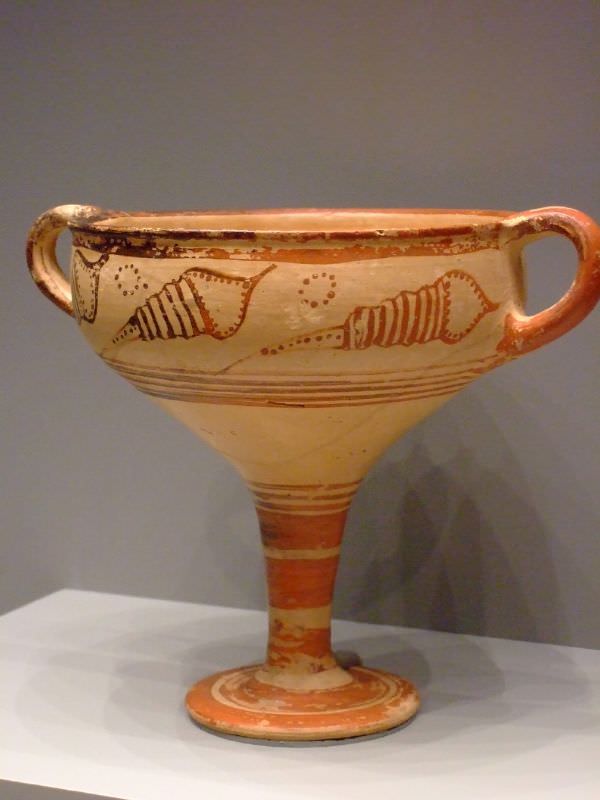 A Mycenaean stemmed cup (1350-1300 BCE) in terracotta and depicting stylized seashells. (The Getty Villa, Malibu, USA).