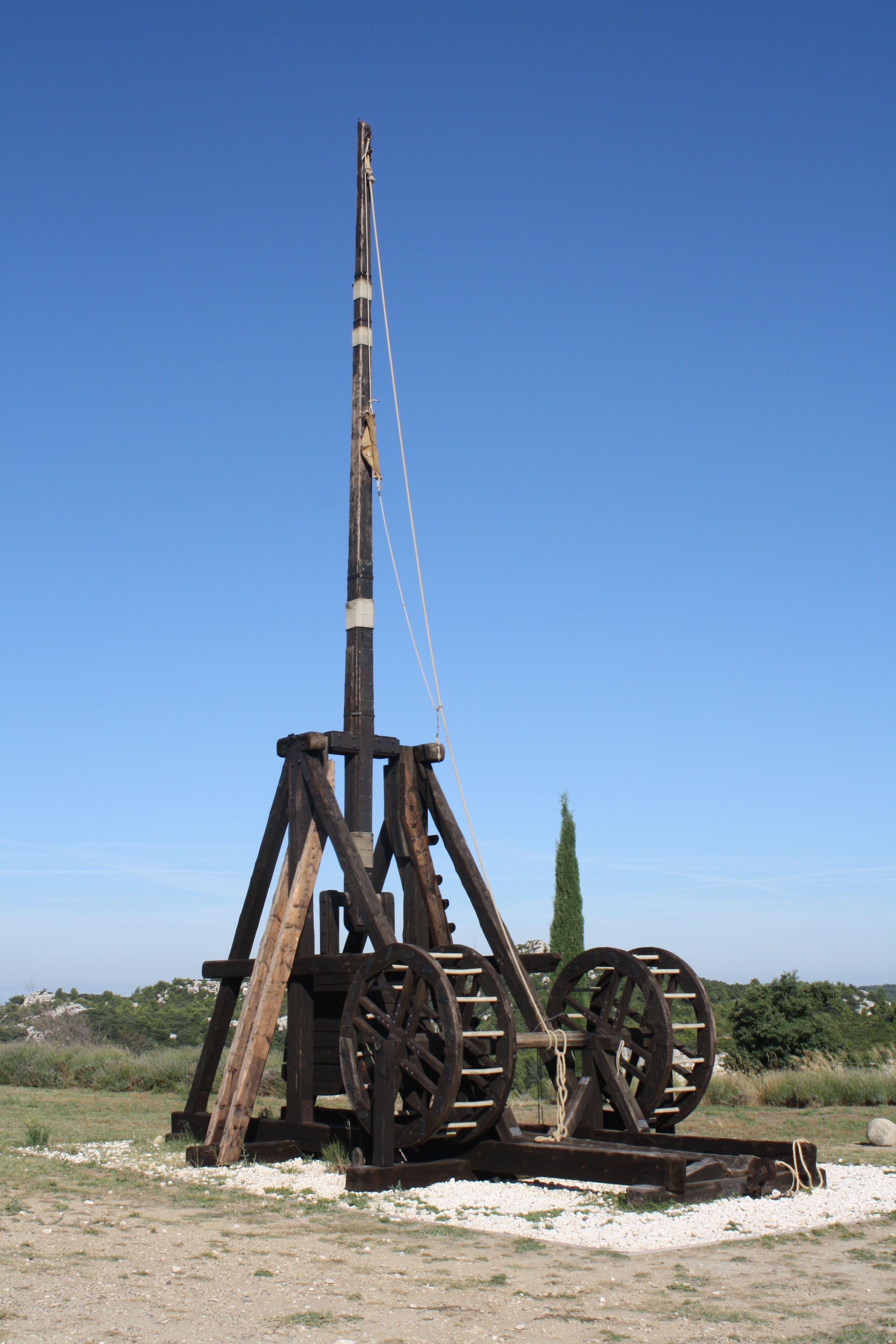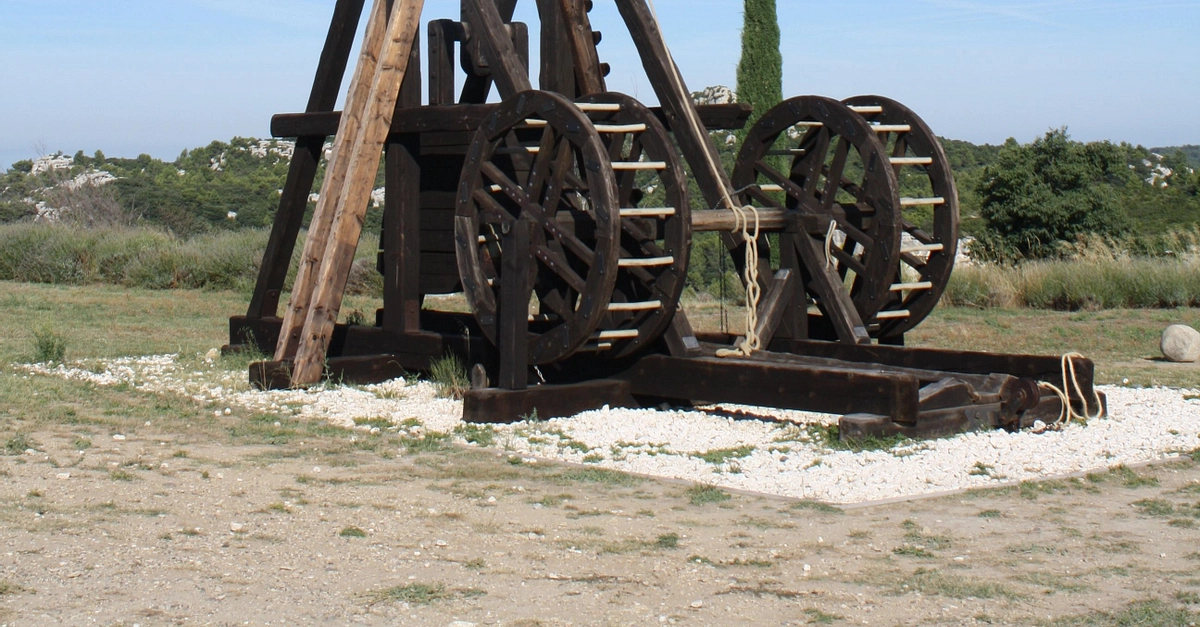 A reconstruction of a medieval catapult or trebuchet of the 12th-14th century CE. Chateau of Les Baux-de-Provence, France. The trebuchet used a counterweight of stones to spring a single arm and propel a stone or incendiary over a distance of several hundred metres.