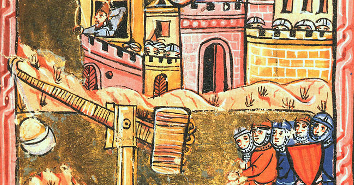 A medieval manuscript (c. 1280 CE) illustration depicting the 1189-91 CE siege of Acre during the Third Crusade. (Bibliotheque Municipale de Lyon, France)