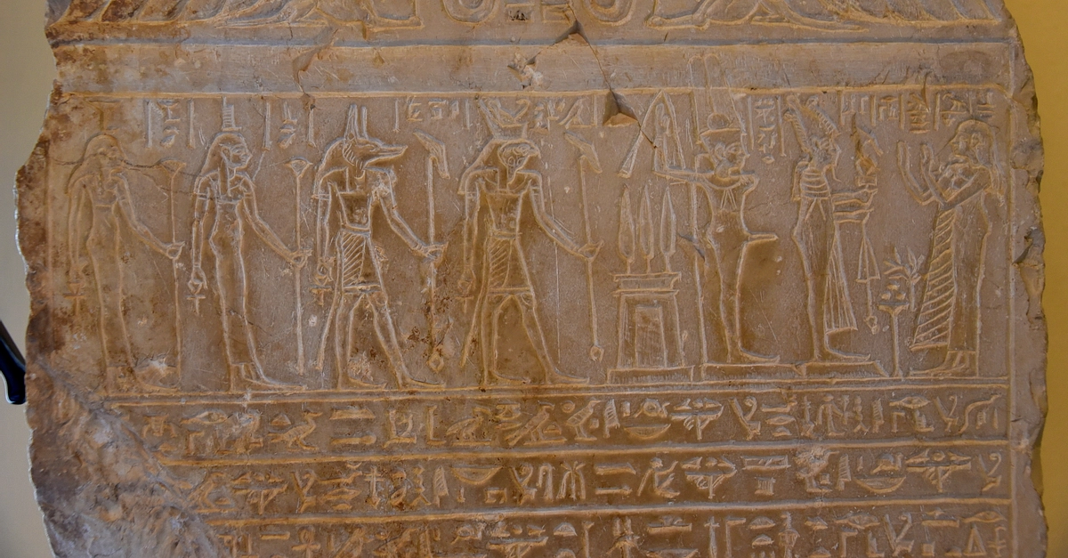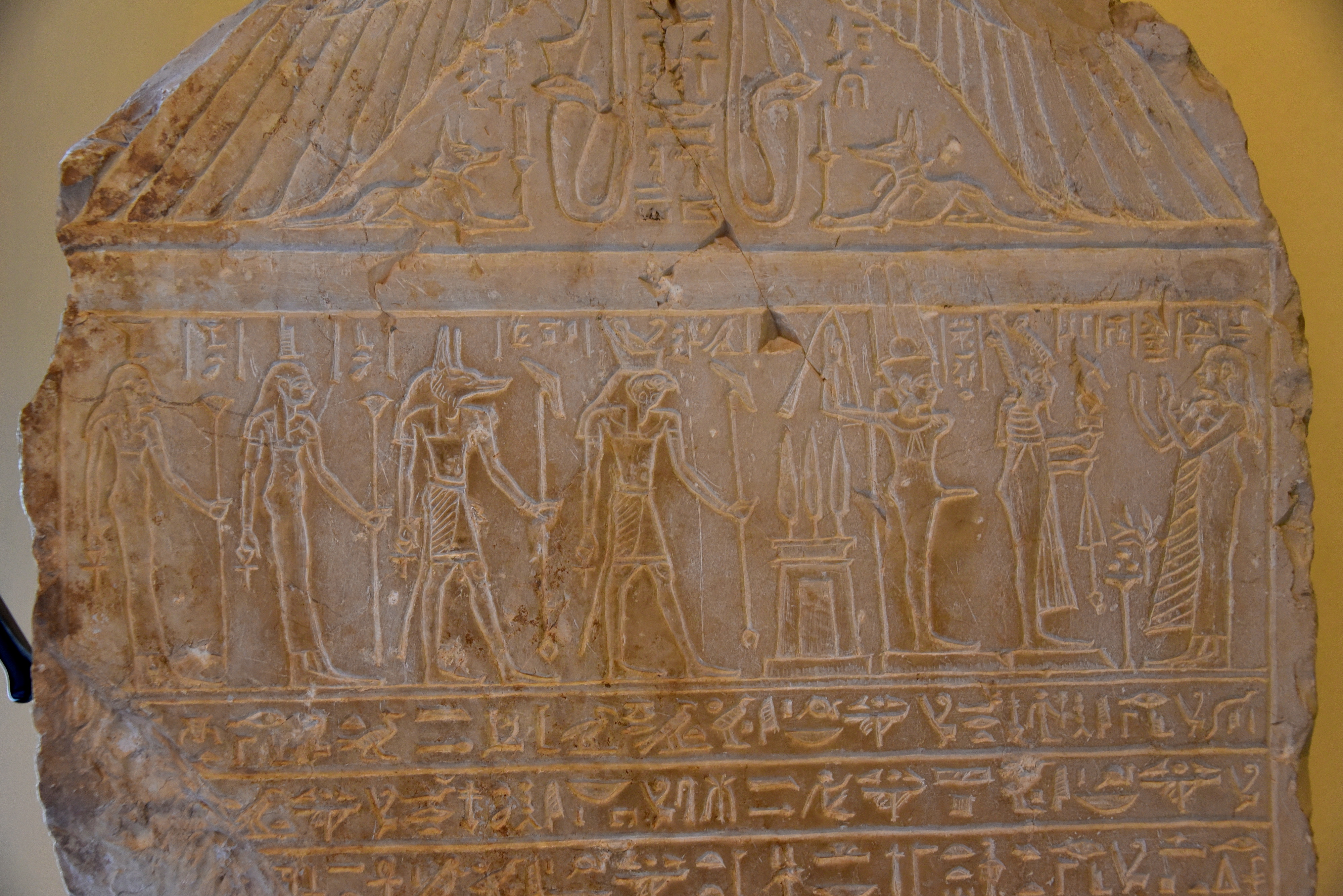 This detail of a funerary stela depicts Takerseb (extreme right), a priestess of the goddess Min-Re, making an offering to the Egyptian gods and goddesses (from right to left: Osiris, Min, Horus, Anubis, Isis, and Maat). Ptolemaic Period, 332-30 BCE. From Egypt. (Ancient Orient Museum, Istanbul, Turkey).