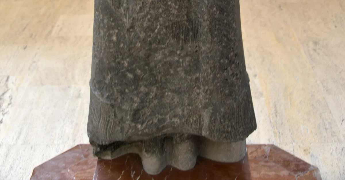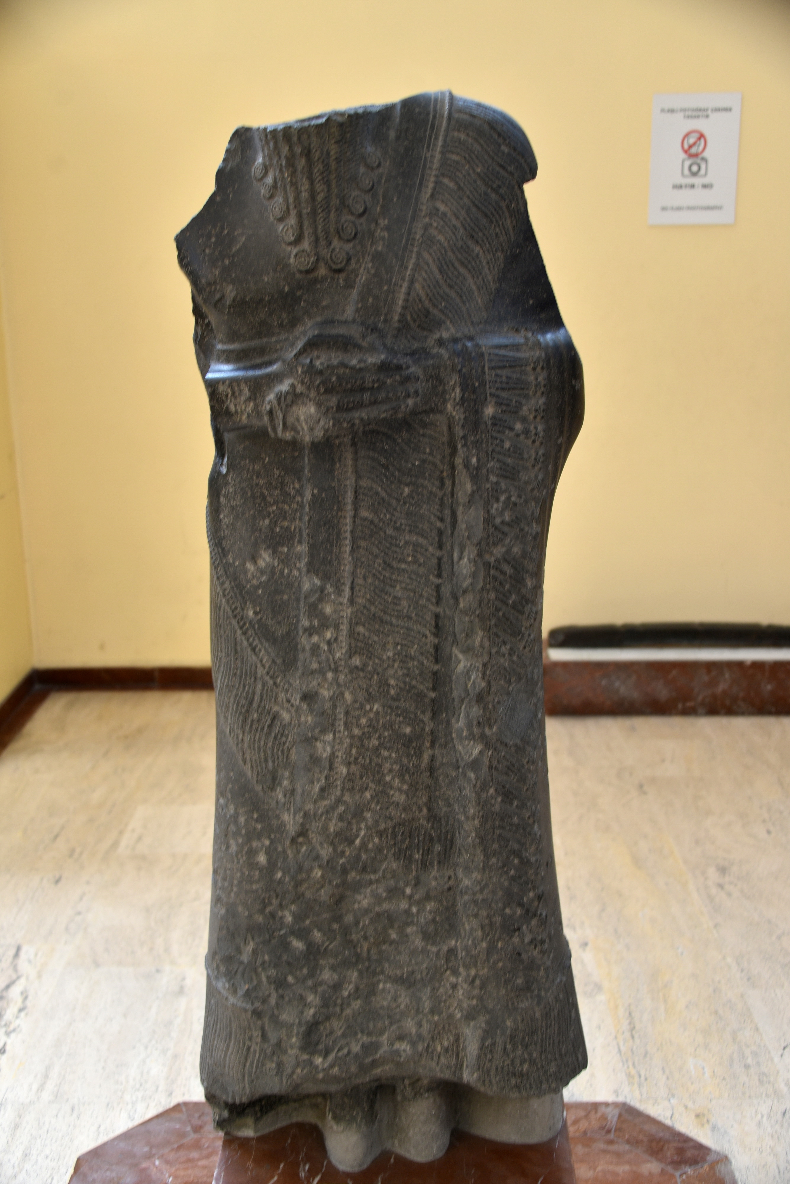 Diorite statue of a standing male, who was a governor of Tura-Dagan (Mari, modern-day Tell Harriri, Syria), Old Babylonian Period, 1894-1594 BCE. The statue was brought from Mari to Babylon as war booty during the Neo-Babylonian Period. From the palace museum of Nebuchadnezzar II at Babylon, in modern-day Iraq. (Ancient Orient Museum, Istanbul, Turkey).