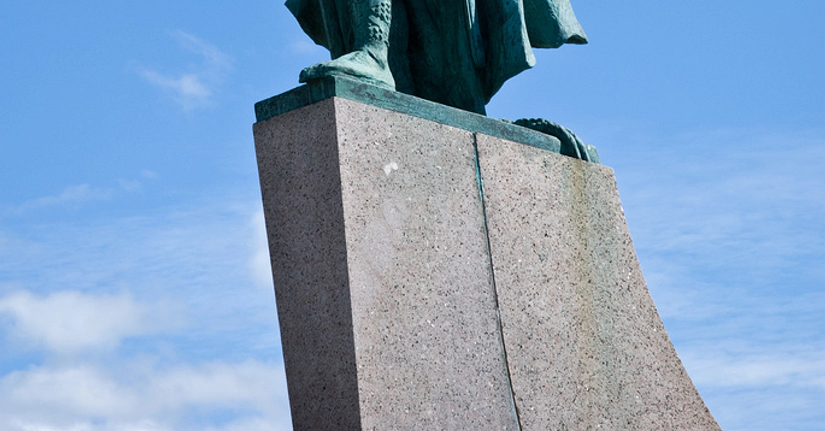 Statue of the Norse Viking Leif Erikson (estimated c. 970-1020 CE) outside Hallgrimskirka in Reykjavik, Iceland. Leif was the son of Erik the Red, founder of the first Norse settlement in Greenland, and is himself often credited with being the first European to set foot on North American soil in Newfoundland, Canada, building the gateway-post of L'Anse aux Meadows there (Leifsbúðir/Straumfjǫrðr in the Vinland Sagas) in the area the Norse called Vinland.