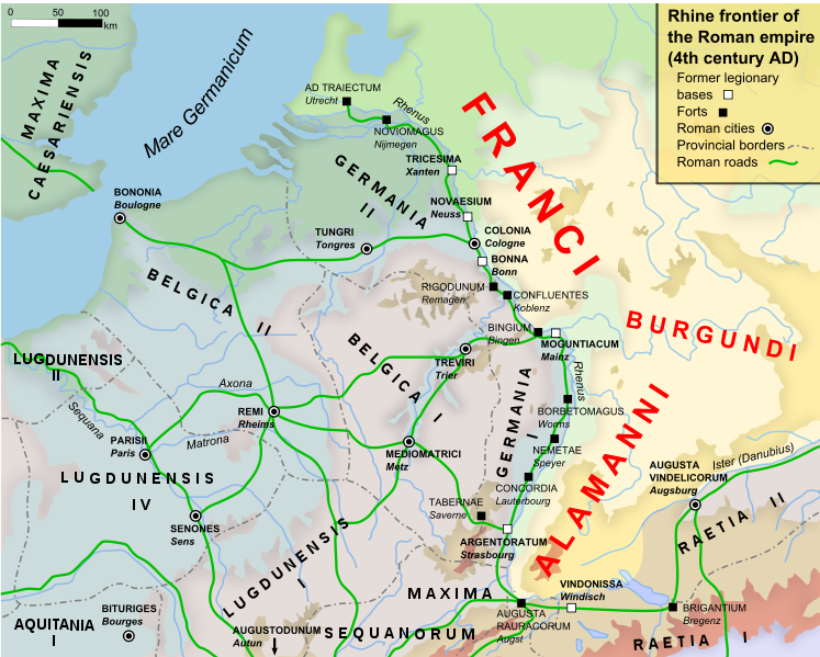 A map showing the Rhine frontier of the Roman Empire in the 4th century CE.
